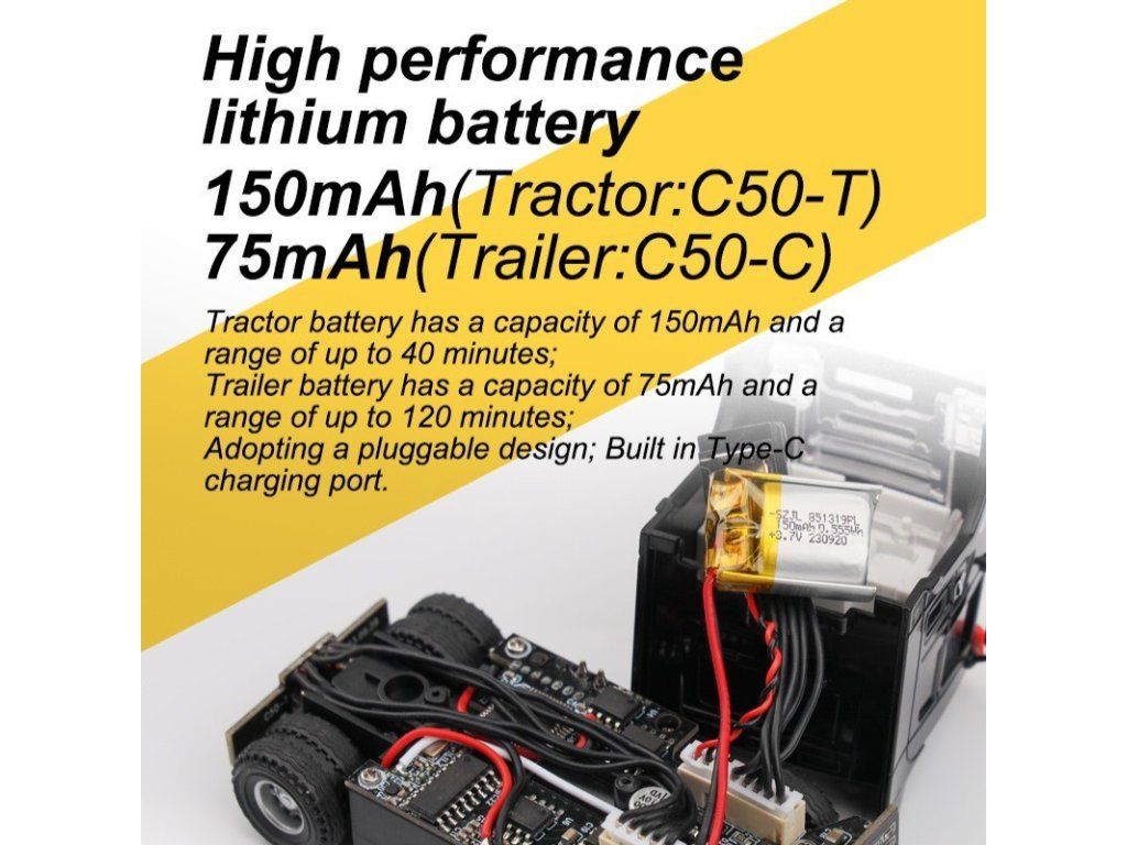 Tento RC kamion, připravený k okamžitému použití (RTR), je mezi dálkově ovládanými modely opravdu jedinečným. Model disponuje přesným proporcionálním řízením a ovládáním plynu, jaké byste očekávali od větších RC automobilů, a nabíjí se jako váš smartphone pomocí připojení USB–C. Díky kompaktnímu měřítku 1/76 můžete manévrovat i v těsných prostorech a užívat si radost z vození nákladů s přáteli a rodinou doma, v kanceláři s kolegy, na cestách nebo téměř kdekoli, kde vás jen napadne!