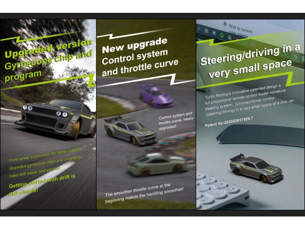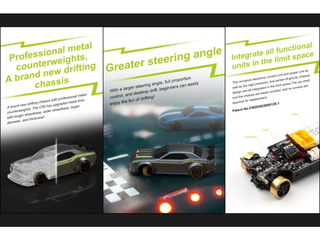 Představujeme první plně proporcionální dálkově ovládané auto velikosti prstu na světě - RC auto 1:76 Turbo Racing. Poprvé v hobby průmyslu s rádiovým ovládáním lze RC vůz takové velikosti ovládat s takovou přesností a jemností. Díky zcela novému patentovanému systému řízení potenciometrem, který je nejmenší svého druhu, můžete ovládat vozidlo přesně tak, jak chcete.