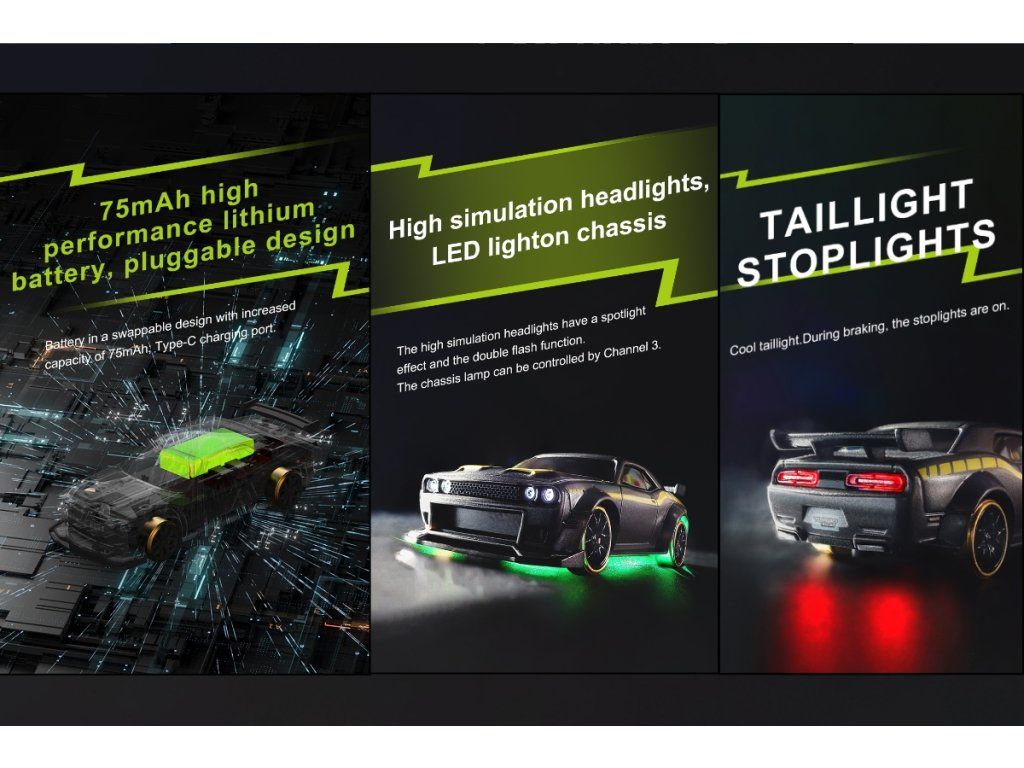 - RWD náhon, vylepšený vestavěný gyroskop, zvýšený úhel zatáčení a kluzká kola pro jízdu v driftu