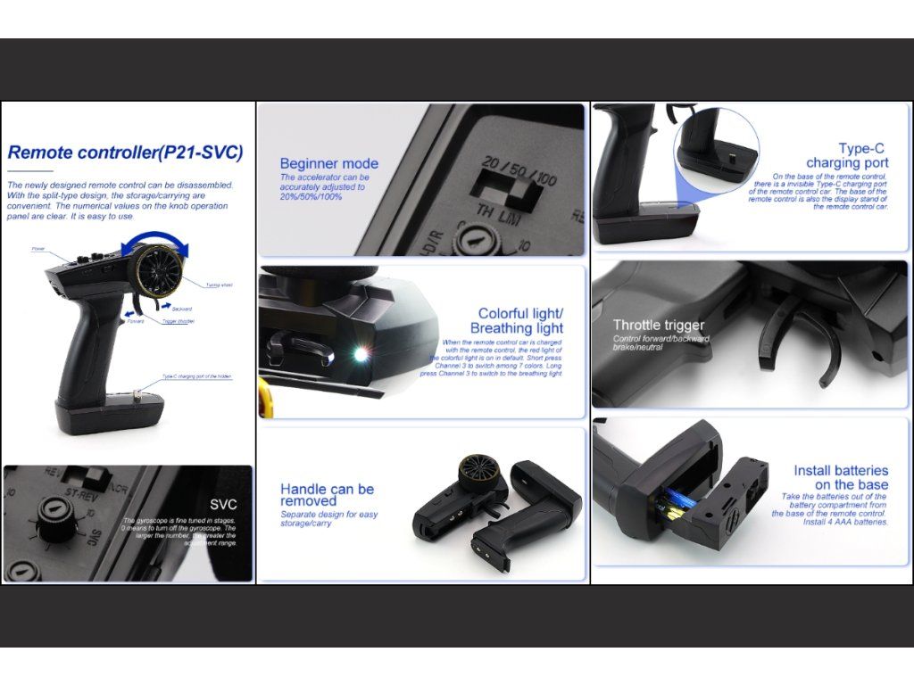 - Rozložitelný čtyřkanálový vysílač dálkového ovládání Turbo Racing P21-SVC