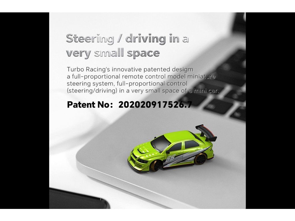 Představujeme první plně proporcionální dálkově ovládané auto velikosti prstu na světě - RC auto 1:76 Turbo Racing. Poprvé v hobby průmyslu s rádiovým ovládáním lze RC vůz takové velikosti ovládat s takovou přesností a jemností. Díky zcela novému patentovanému systému řízení potenciometrem, který je nejmenší svého druhu, můžete ovládat vozidlo přesně tak, jak chcete.