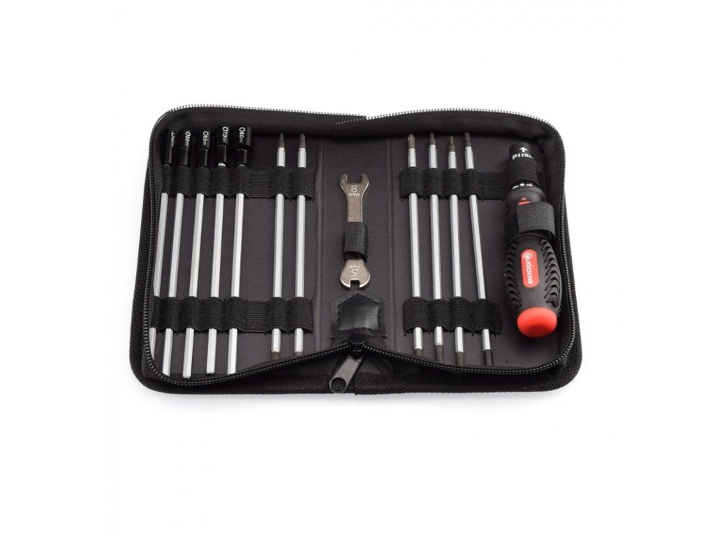 Když jdete do skateparku, štěrkovny nebo do lesa se svým RC Autem, obvykle nechcete mít s sebou příliš mnoho věcí. Abyste se nemuseli obejít bez nejpotřebnějšího nářadí, Ruddog Products nyní nabízí praktickou sadu nářadí 19 v 1 ! Nadšenci modelů automobilů najdou vše, co potřebují v praktické brašně, aby mohli rychle provést drobné opravy nebo úpravy. Kromě výběru šroubováků, šestihranných a šestihranných bitů v běžných velikostech je součástí balení také oboustranný klíč a samozřejmě ergonomická pogumovaná rukojeť.