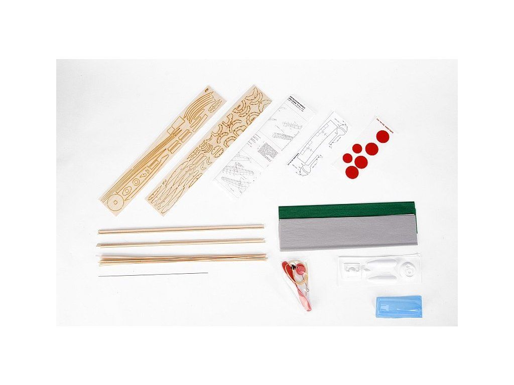 Stavebnice obsahuje: balsové laserem vyřezávané díly, balsové nosníky, vakuově lisované díly (kryt motoru, kryt kabiny...), plastovou vrtuli s hřídelí a hlavicí, gumový svazek (soutěžní guma FAI TAN II), kola, ocelovou strunu na podvozek a další drobné díly, barevný potahový papír, aršík samolepek, stavební plán.
