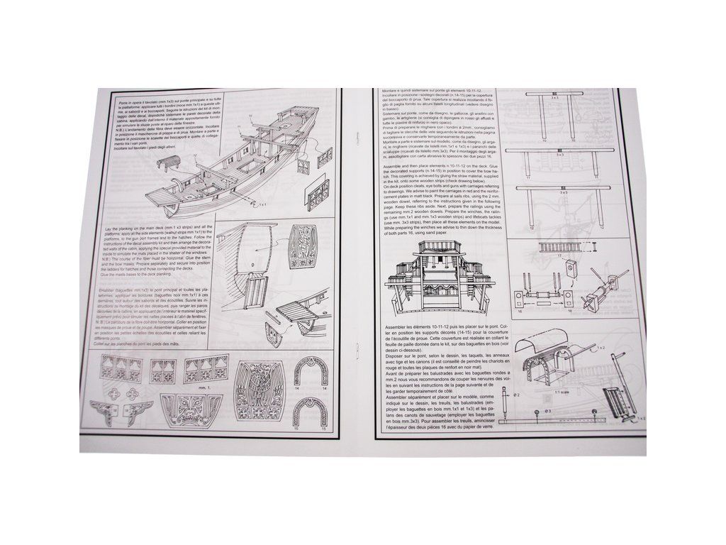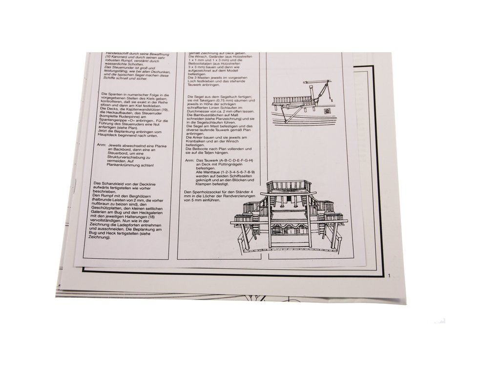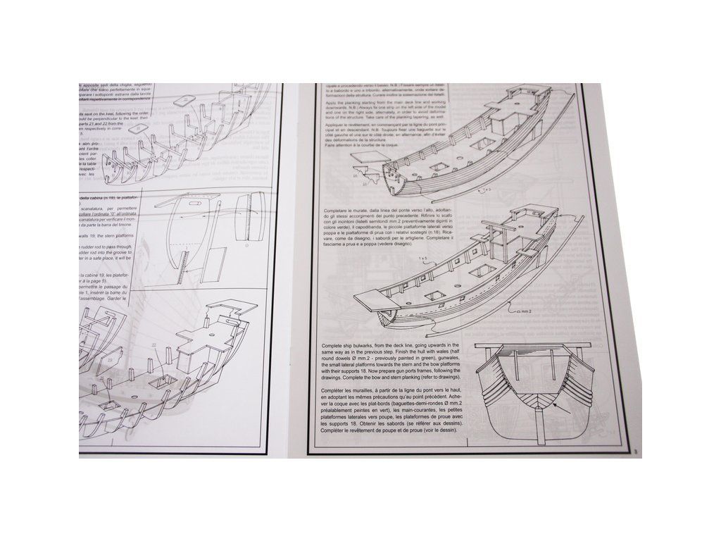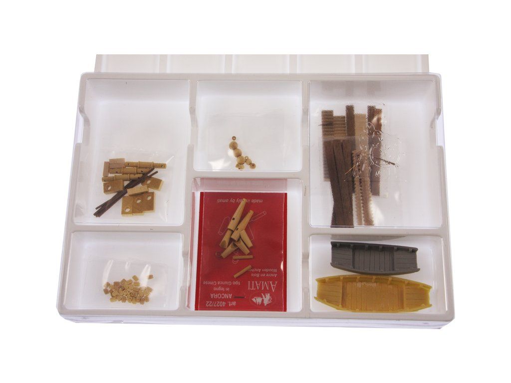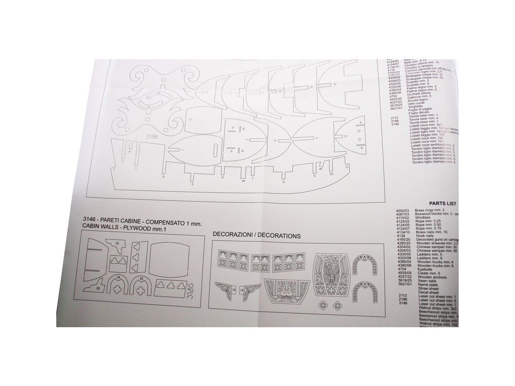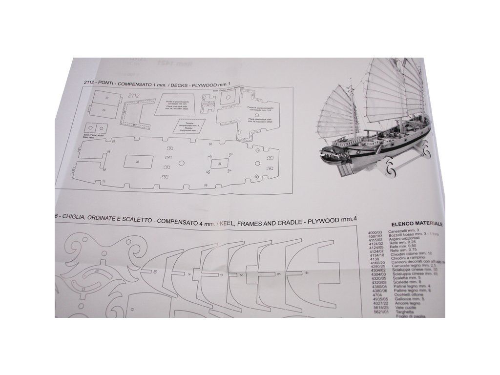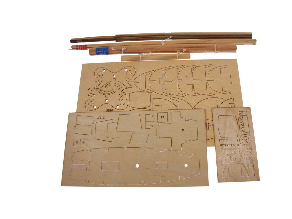 Balení obsahuje sadu překližkových dílů, sadu dřevěných lišt o různém průřezu, blistr s drobnými díly, sadu výkresů a manuál anglický, německý, francouzský a italský.