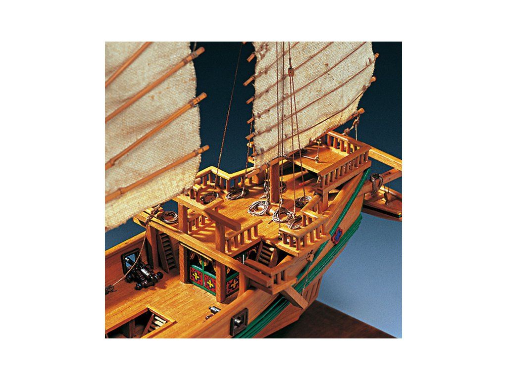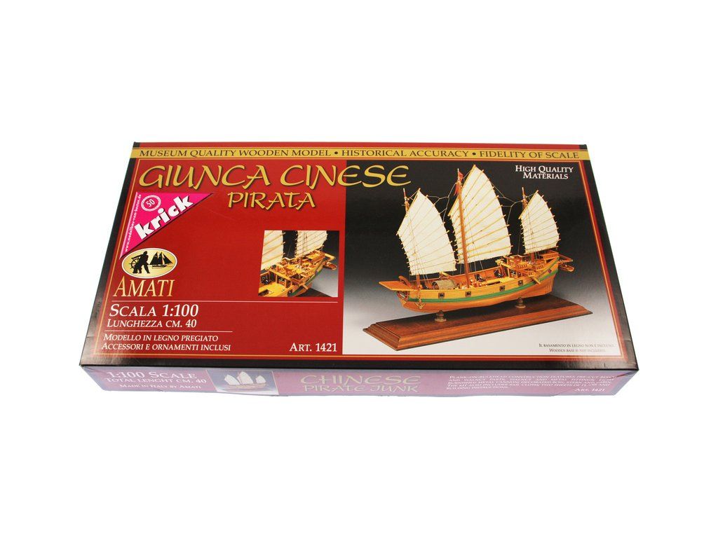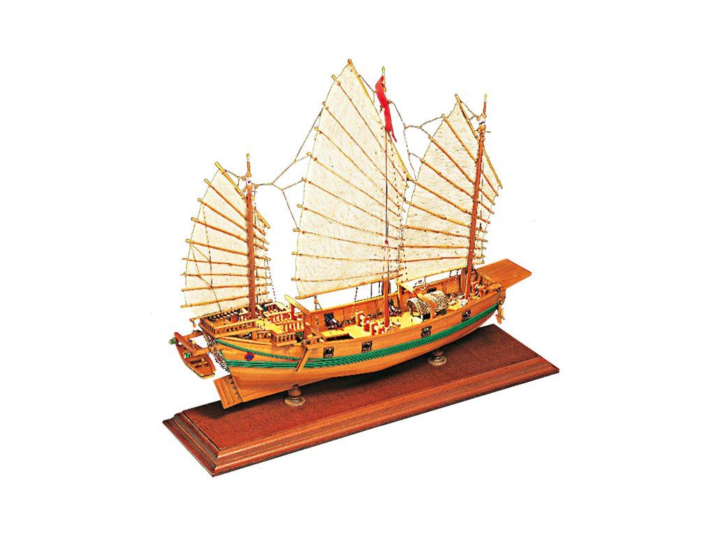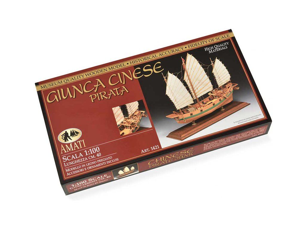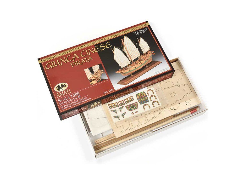 Stavebnice statické makety historické lodi AMATI Čínská džunka 1:100 kit. Typická čínská loď, jaké se plavily po řekách a přístavech jako obchodní nebo jako loupeživé s piráty. Tyto charakteristické tvary trupu se dnes ještě staví. Dřevěné díly jako kýl a obšívka jsou řezány laserem, obsaženy jsou plachty, lanoví, doplňky.