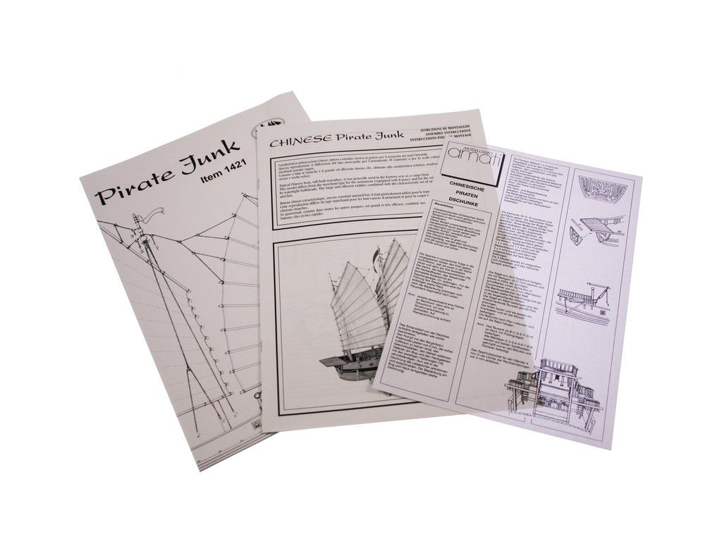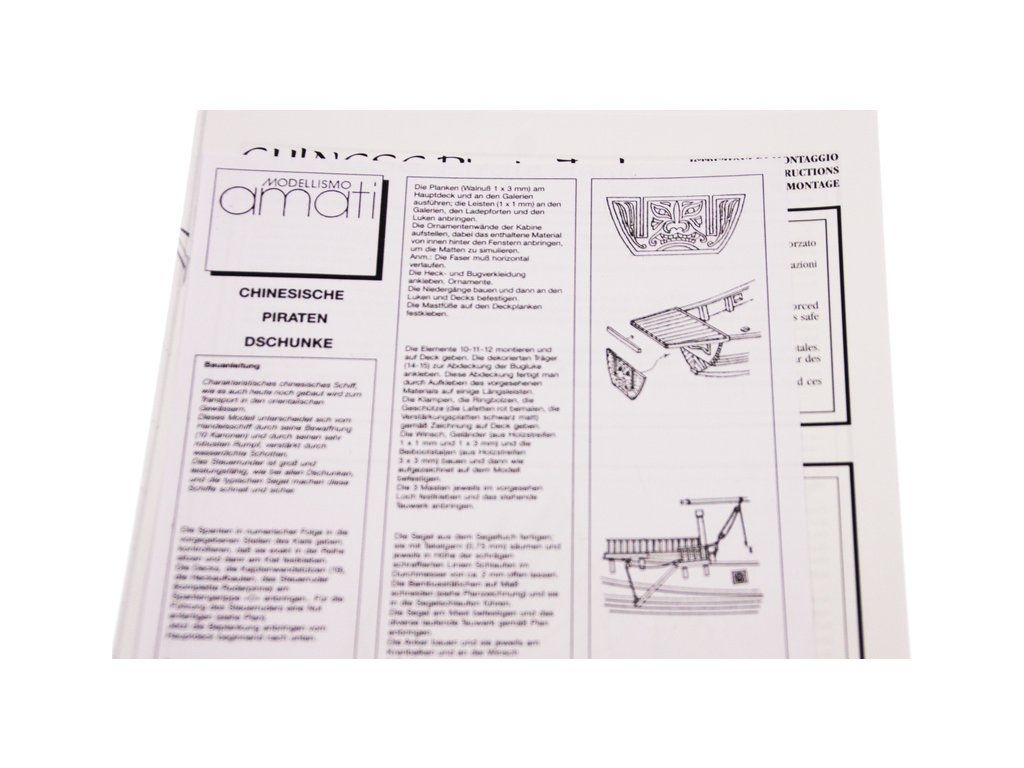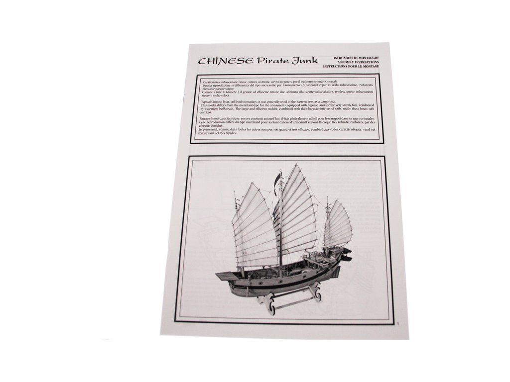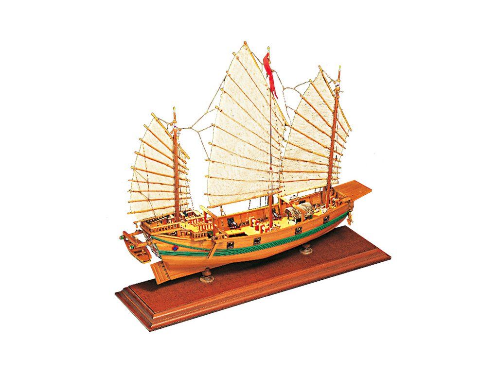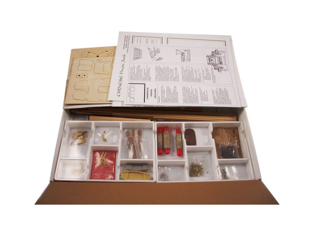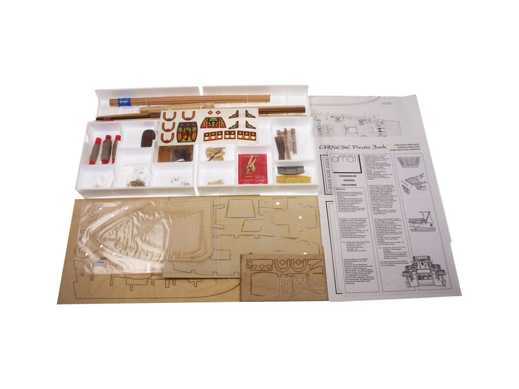 Stavebnice statické makety historické lodi AMATI Čínská džunka 1:100 kit. Typická čínská loď, jaké se plavily po řekách a přístavech jako obchodní nebo jako loupeživé s piráty. Tyto charakteristické tvary trupu se dnes ještě staví. Dřevěné díly jako kýl a obšívka jsou řezány laserem, obsaženy jsou plachty, lanoví, doplňky.