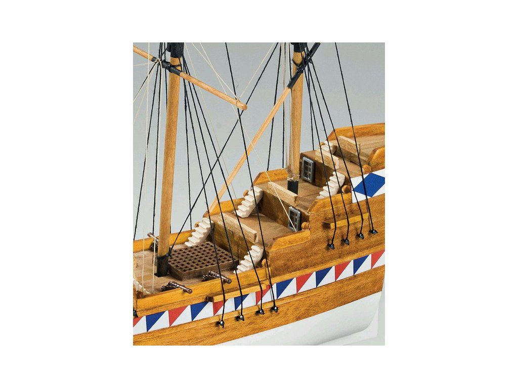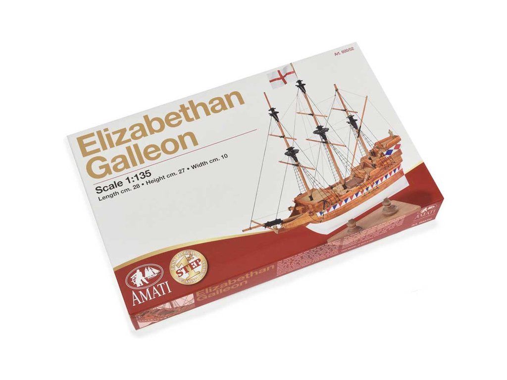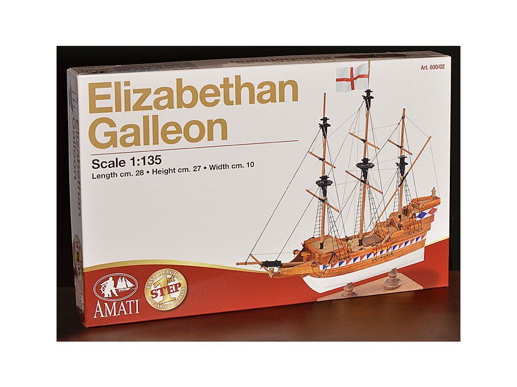 Stavebnice statické makety historické lodi, AMATI Galeóna 1:135 First step kit. Historické lodě jsou jedněmi z nejoblíbenějších lodních modelů, proto byla vytvořena série First step kit, která je určena pro začátečníky. V setu je hotový dřevěný trup lodi, kýl s výřezy a drobné příslušenství. Plachty nejsou v balení.