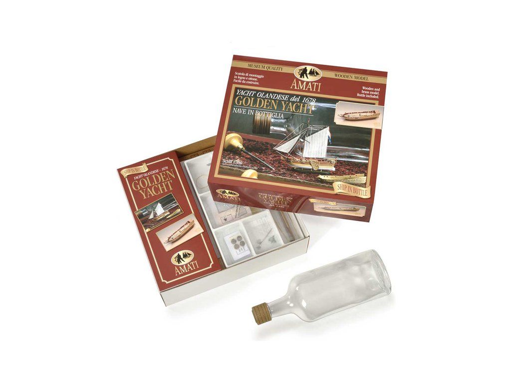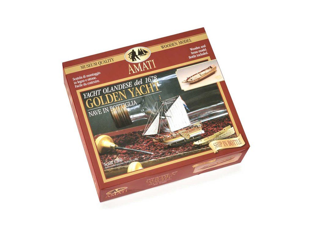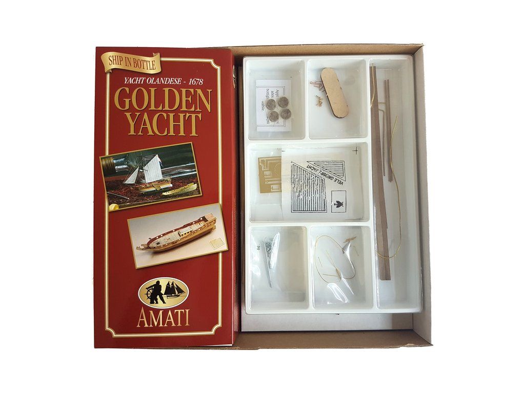 Dřevěná stavebnice modelu lodi Golden Yacht od AMATI v měřítku 1:300 obsahuje všechny potřebné dílky pro sestavení. Balení obsahuje laserem řezané dřevěné díly, leptaná mosazná paluba, kýl, kování, ozdobné prvky, krásnou skleněnou láhev a stavební plánek.