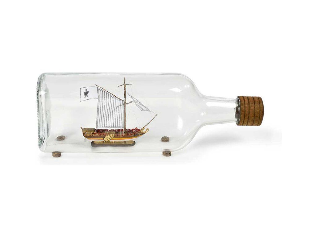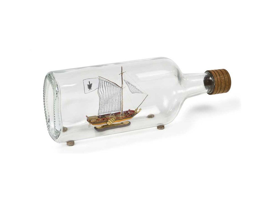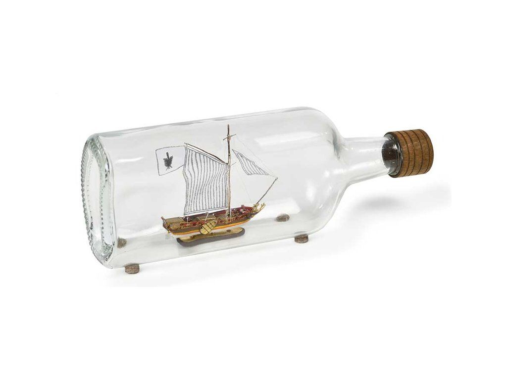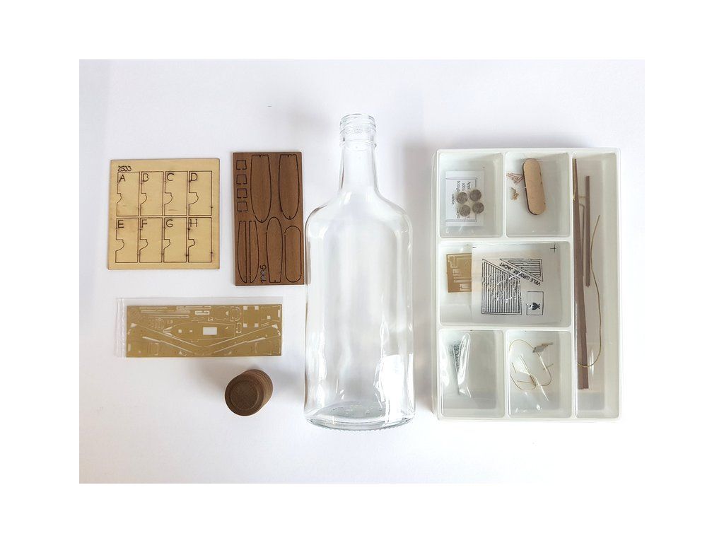 Balení obsahuje hotový polotovar trupu, překližkové díly, dřevěné lišty, skleněná láhev, blistr s drobnými díly, sadu výkresů a návod anglický a italský.