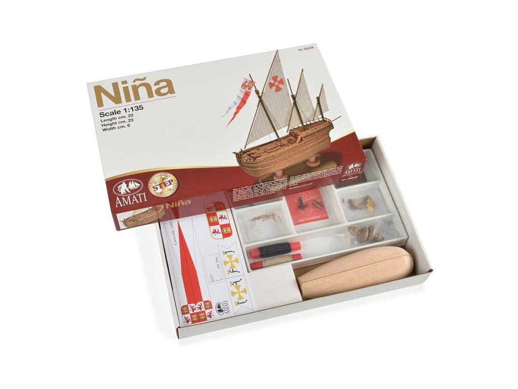 Stavebnice neplovoucího modelu AMATI Nina v měřítku 1:135 z roku 1492. Jedna ze tří lodí, s nimiž Kryštof Kolumbus objevil Ameriku. Model je stavebnice ze série "First Step" od Amati pro začínající modeláře. Stavebnice obsahuje vyřezané dřevění díly, kovové díly, stojánek a návod.