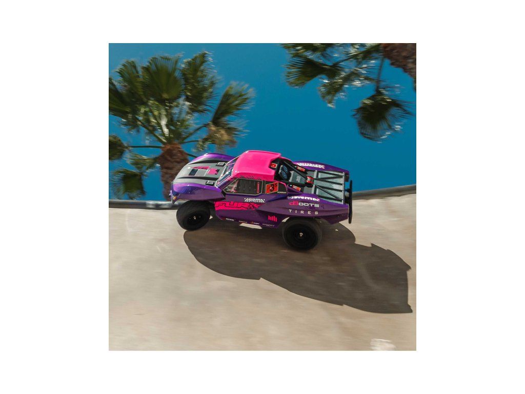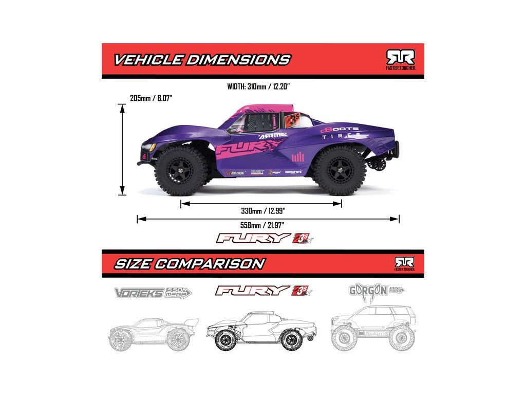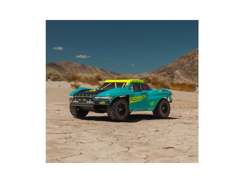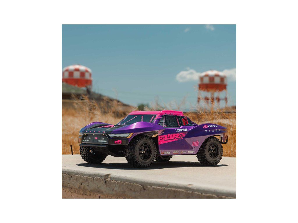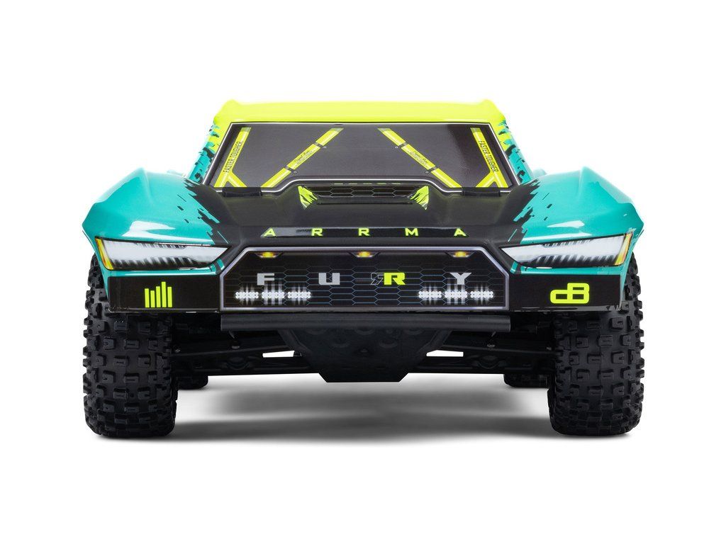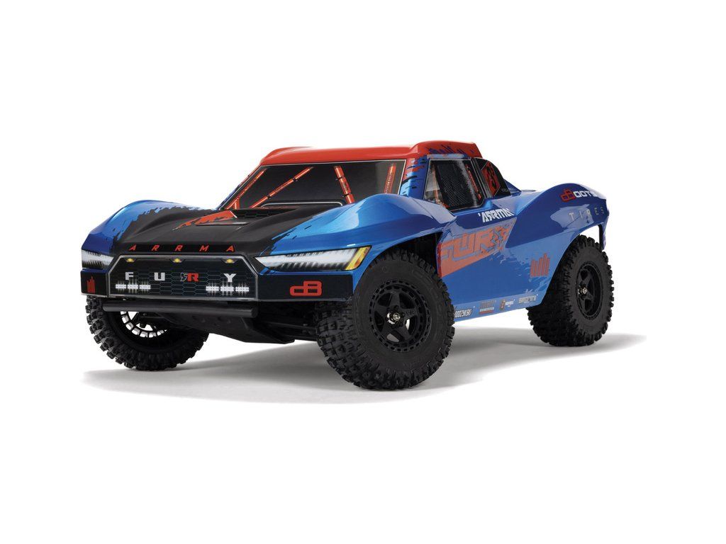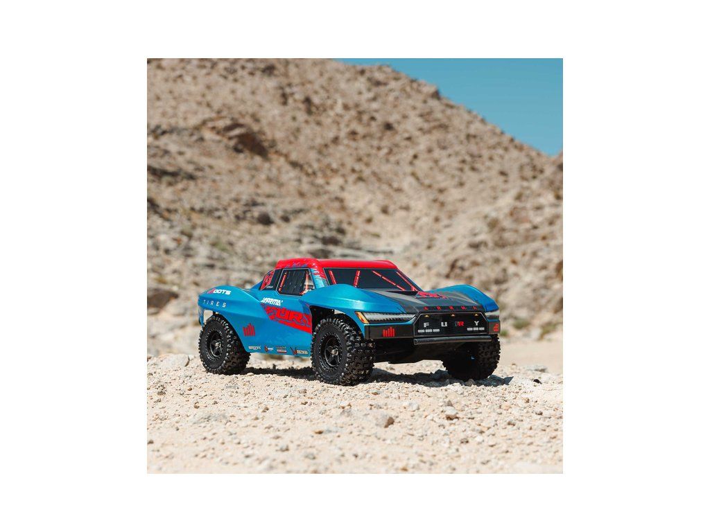 RC model auta Arrma Fury 223S BLX v měřítku 1:10, s náhonem 2WD, výkonným střídavým motorem a rychlostí až 80 km/h. Nezávislé zavěšení, olejové tlumiče, řídící jednotka Spektrum 45A SLT 2-3S LiPo, elektronická stabilizace DSC.