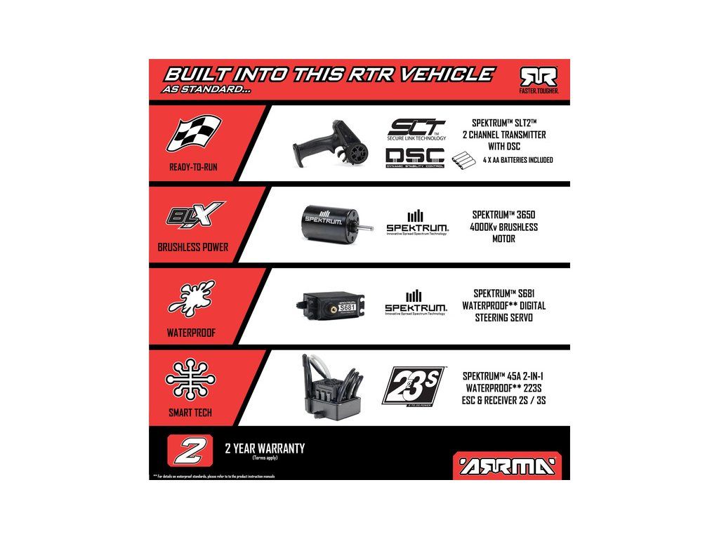 - Pro maximální možnou rychlost LiPo akumulátor Spektrum LiPo 11.1 V 5000 mAh s technologií Smart, nebo Spektrum G2 LiPo 11.1 V 5000 mAh s technologií Smart G2.