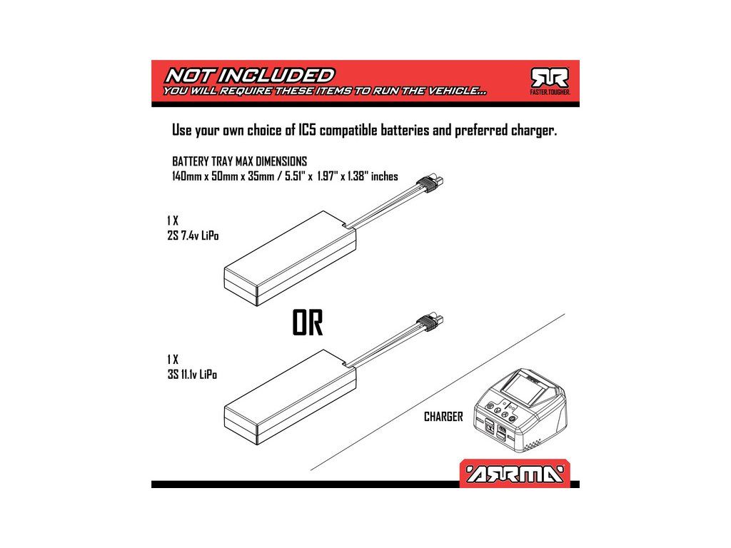 Model lze provozovat na 2 až 3 článkový LiPo akumulátor. Akumulátor by měl být osazen konektorem EC5 nebo IC5. Pro běžné ježdění doporučujeme 2 článkový LiPo akumulátor (7.4 V).