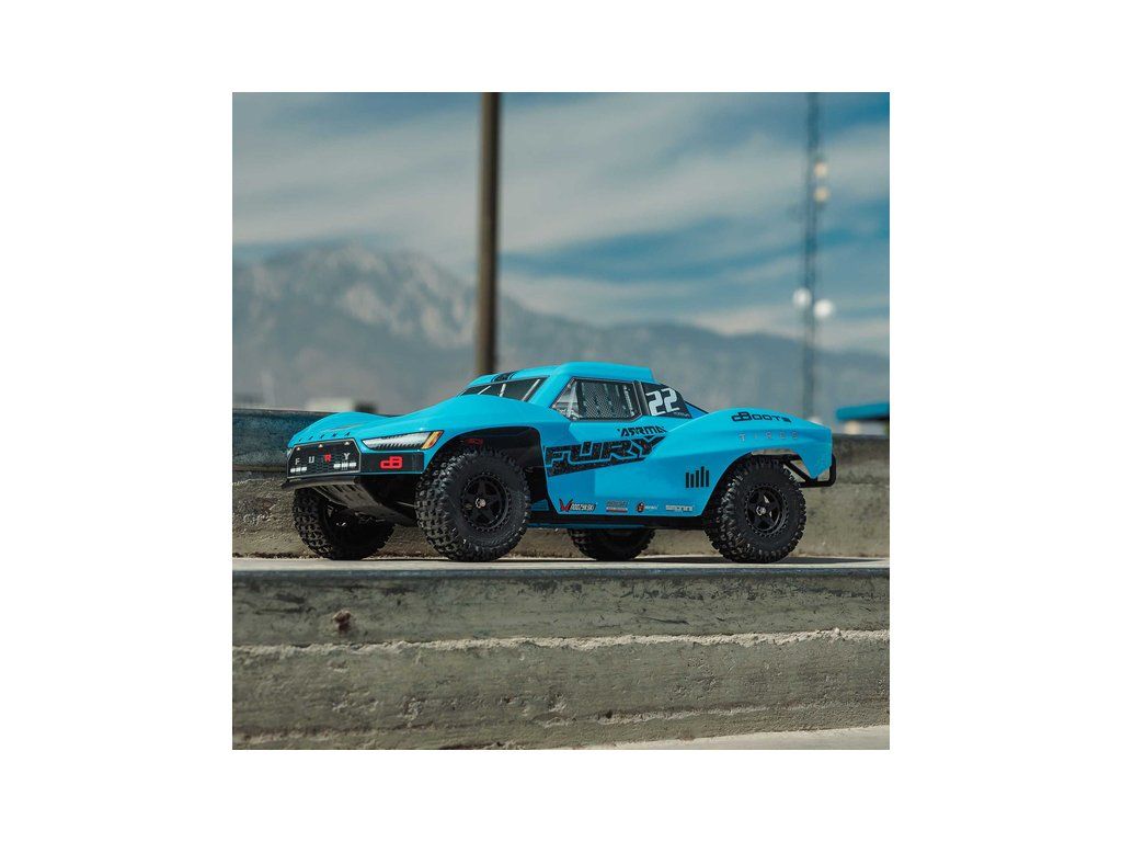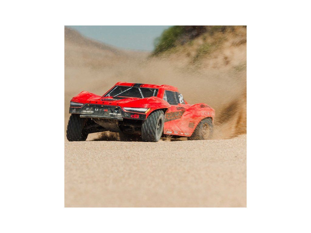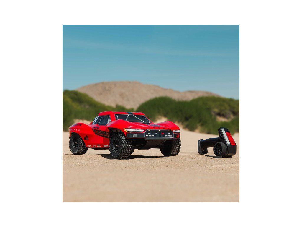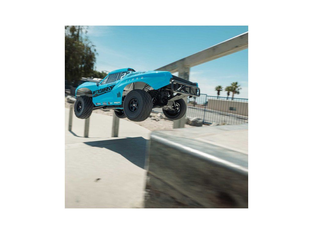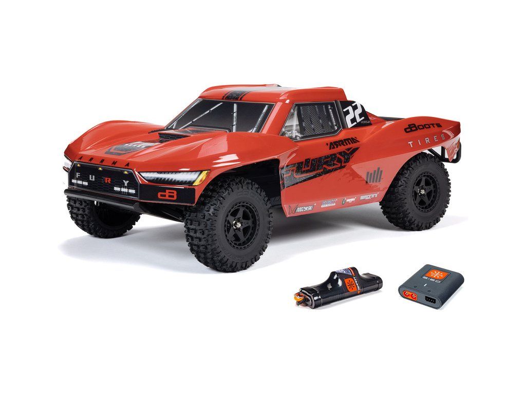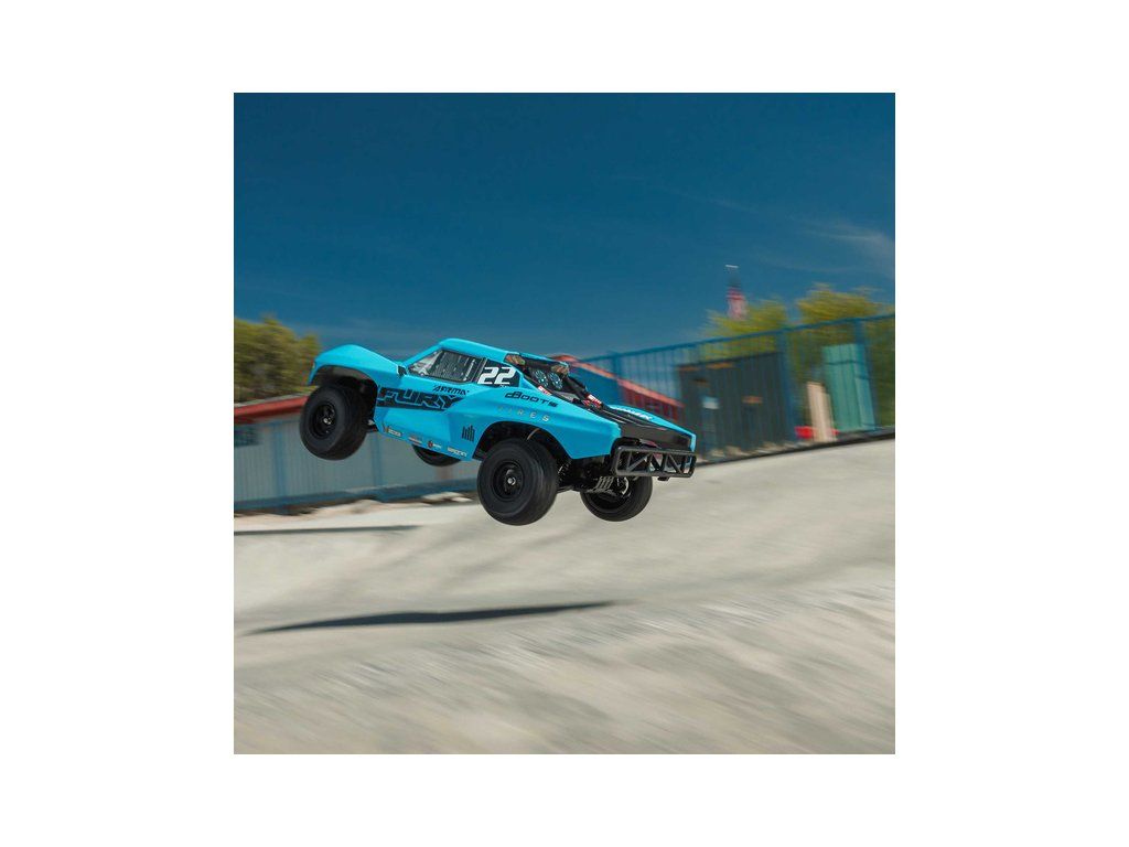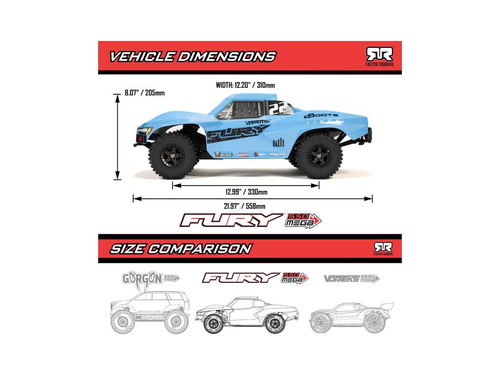 RC model Arrma Fury Mega 550 1:10 RTR je cenově dostupné auto na dálkové ovládání typu Short Course s náhonem 2WD, nezávislým zavěšením, olejovými tlumiči, proporcionálním řízením a stejnosměrným motorem. RC souprava SLT 2.4 GHz. V balení NiMH akumulátor a USB-C nabíječ.