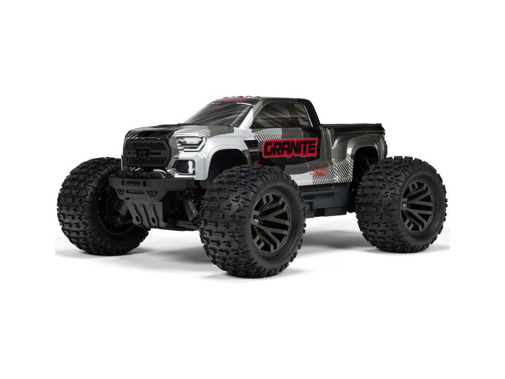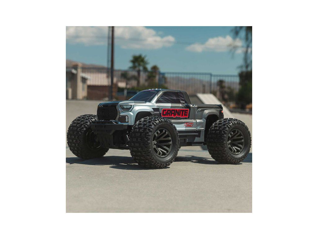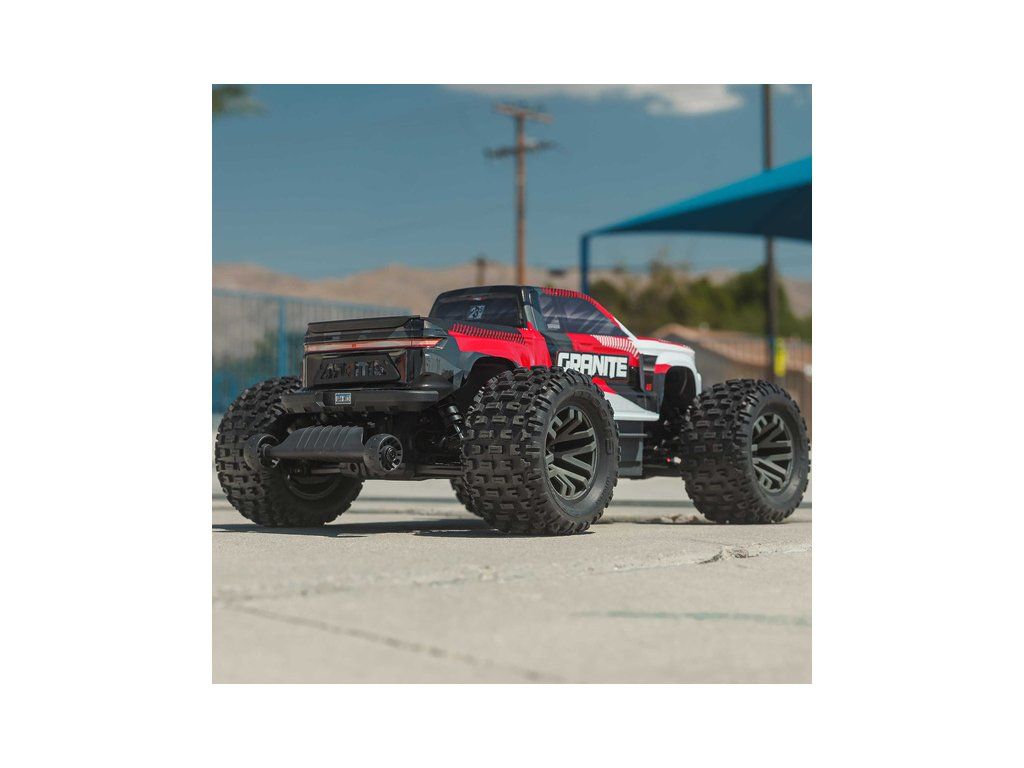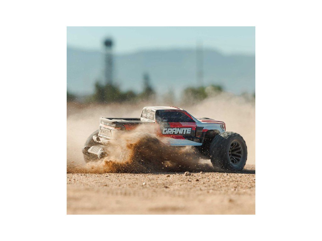 RC model Monster trucku Arrma Granite 223S BLX s výkonným střídavým motorem a rychlostí až 80 km/h. Náhon 4WD, nezávislé zavěšení, olejové tlumiče, řídící jednotka Spektrum 80A SLT, napájení 2-3S LiPo, elektronická stabilizace DSC.