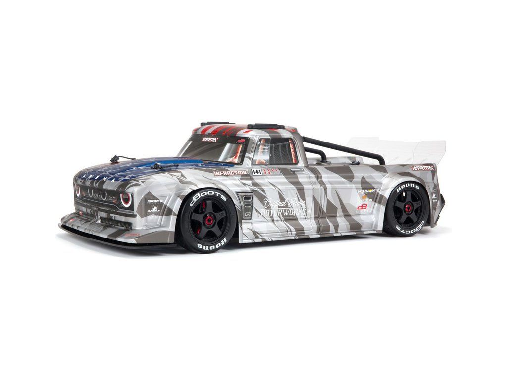 RC model auta Arrma Infraction, v provedení Street Bash pro jízdu na šotolině, trávě a tvrdých površích, rychlostí až 120 km/h. Model je snadno říditelný díky elektronické stabilizaci AVC. Elektronika Spektrum Smart. Speciální ruční brzda pro driftování.