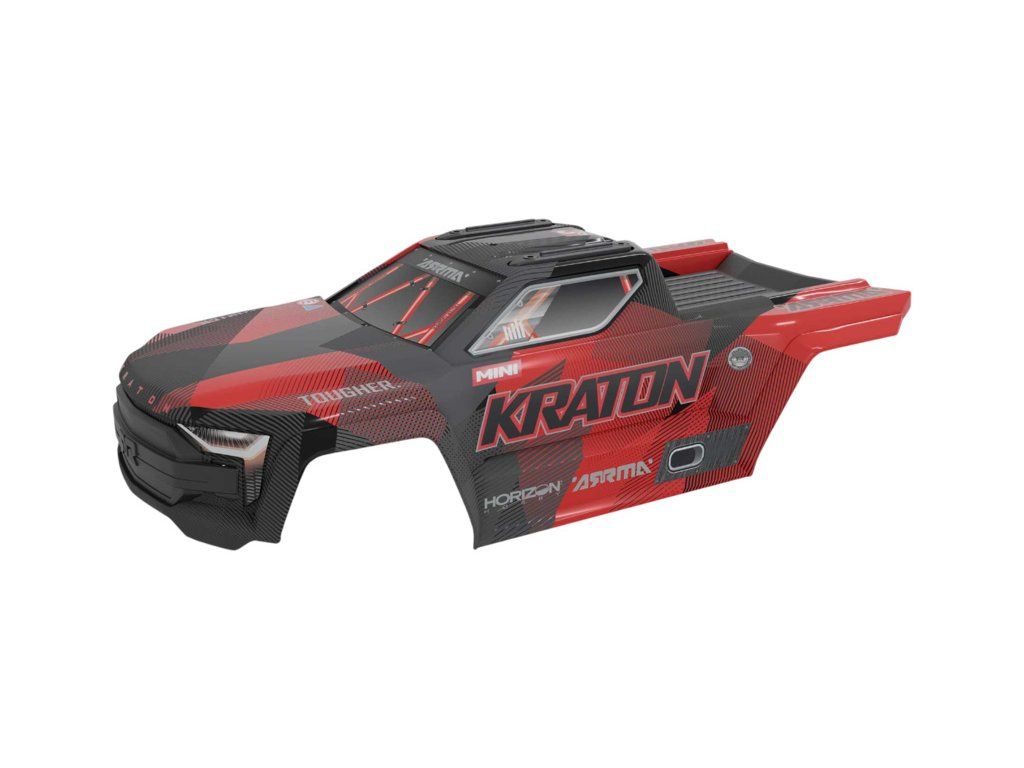 Arrma karosérie černá/červená: Mini Kraton. Nabarvená, ořezaná karoserie s předvrtanými otvory. Vyrobeno z odolného polykarbonátu.