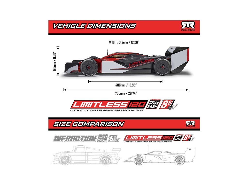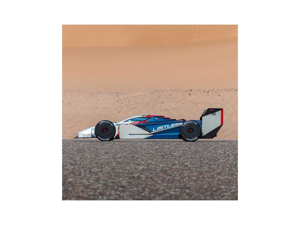 RC model auta Arrma Limitless 8S BLX 1:7 je silniční speciál v designu formule pro zkušené řidiče s rychlostí přes 110 km/h, respektive až 190 km/h s obsaženým rychlostním paketem. Střídavý motor a regulátor Spektrum 160A, výkonné servo, vysílač DX3 a přijímač se stabilizací AVC.