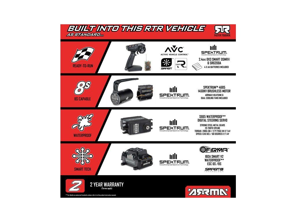- Pro maximální rychlost, výkon a delší dobu provozu LiPo akumulátory Spektrum G2 14.8 V 6800 mAh s technologií Smart G2.