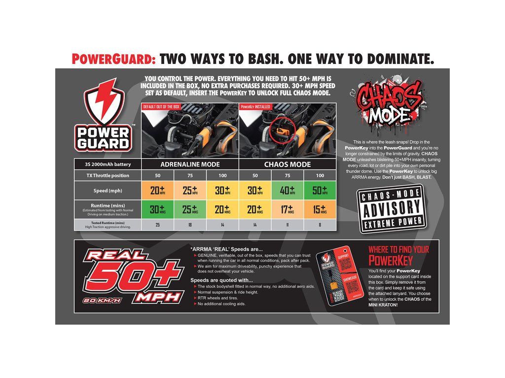 Mini Kraton 3S 1:16 je malý, zábavný a neskutečně výkonný RC model. Technologie PowerGuard umožňuje všestranné použití pro začátečníky i zkušené, od pomalejší, delší jízdy (30 km/h, 30 min) až po rychlost přes 80 km/h. Odolné šasi, náhon 4x4, stabilizace DSC.