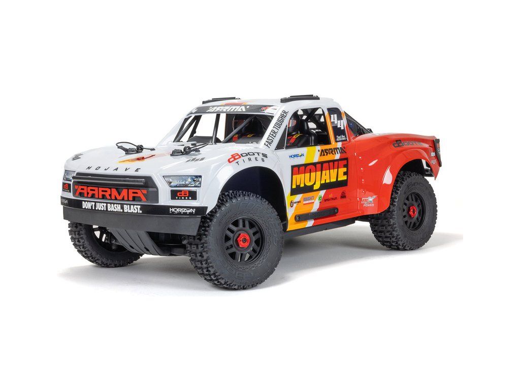 RC model pouštního závodního vozu - Arrma Mojave 4S BLX 1:8 RTR se střídavým motorem, jede rychlostí až 80 km/h. Odolné kompozitní šasi, pohonné ústrojí nově se středovým diferenciálem, detailní karoserie, hliníkové komponenty, olejové tlumiče. Špičková elektronika Spektrum.