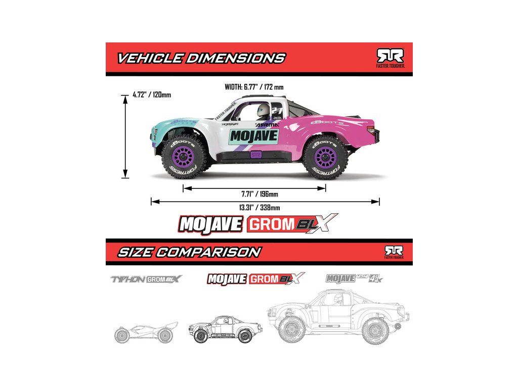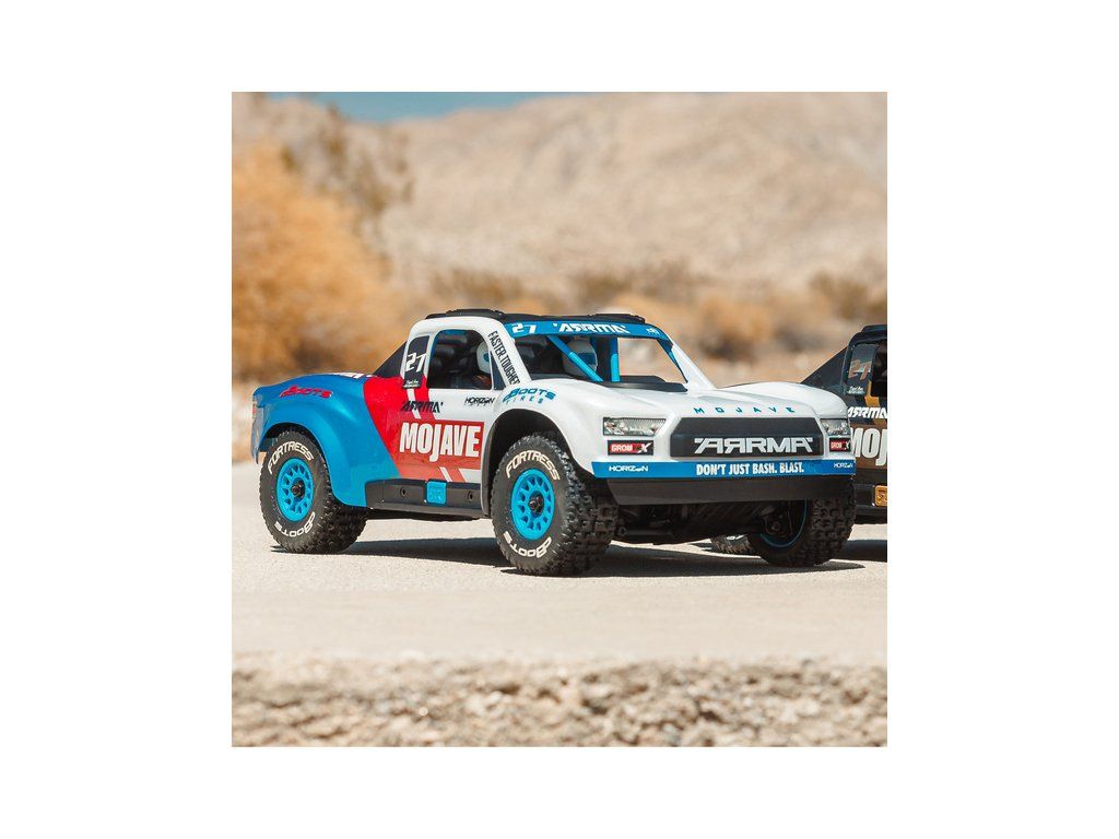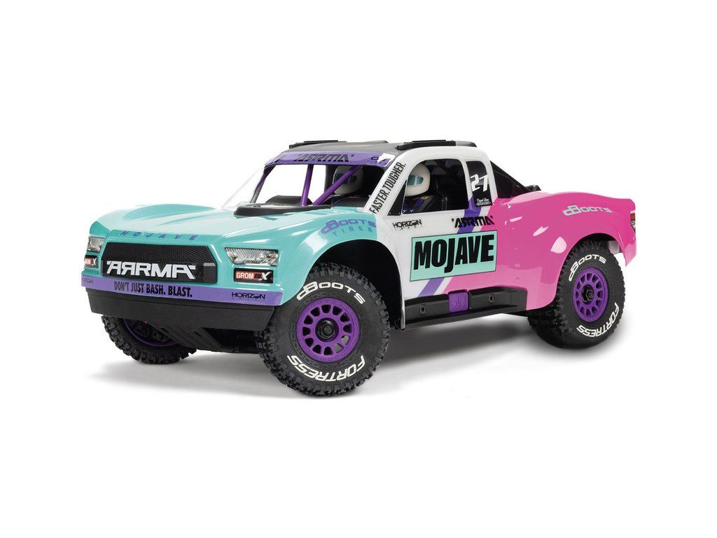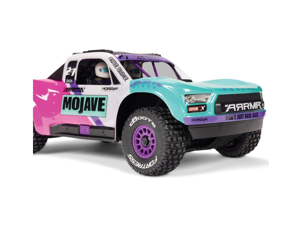 RC model auta Arrma Mojave Grom v měřítku 1:16, s náhonem 4WD, výkonným střídavým motorem a rychlostí až 56 km/h. Precizně zkonstruovaný malý zábavný model pouštního Off-roadu. Továrně instalované upgrady, stabilizace DSC. Včetně baterie 2S LiPo a USB nabíječe.