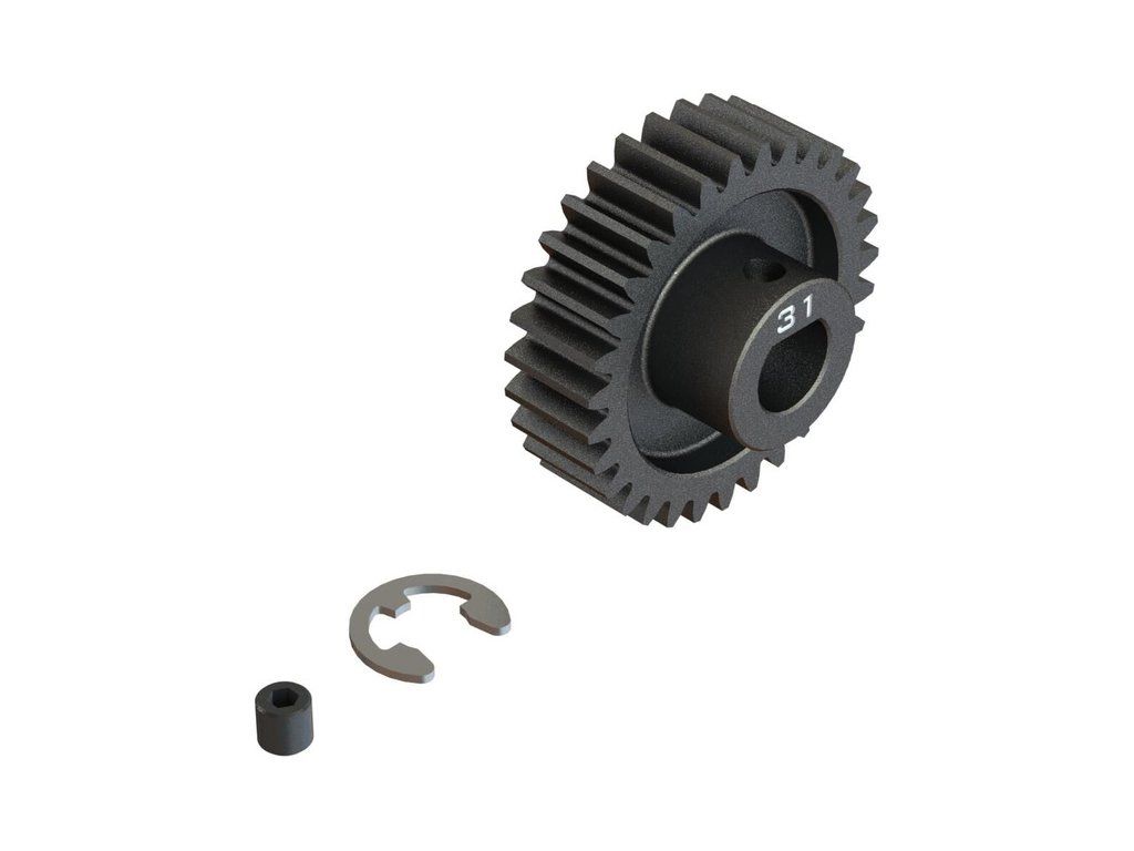 Arrma ocelový pastorek 31 zubů, modul M1, otvor Safe-D8. Otvor ve tvaru 'D' odpovídá profilu hřídele motoru s hřídelí 8mm a drážkou, proto se nemůže pastorek na hřídeli protočit. Stavěcí šroub - M4 x 4mm, segrovka 6mm. Precizně vyrobený široký profil zubu pro hladký chod.