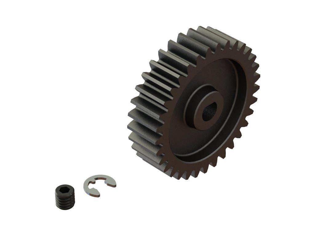 Arrma ocelový pastorek 33 zubů, modul M1, otvor Safe-D5. Otvor ve tvaru 'D' odpovídá profilu hřídele motoru s hřídelí 5mm a drážkou, proto se nemůže pastorek na hřídeli protočit. Stavěcí šroub - M4 x 4mm, segrovka 3,2mm. Precizně vyrobený široký profil zubu pro hladký chod.