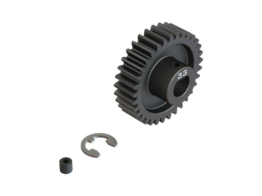 Arrma ocelový pastorek 33 zubů, modul M1, otvor Safe-D8. Otvor ve tvaru 'D' odpovídá profilu hřídele motoru s hřídelí 8mm a drážkou, proto se nemůže pastorek na hřídeli protočit. Stavěcí šroub - M4 x 4mm, segrovka 6mm. Precizně vyrobený široký profil zubu pro hladký chod.