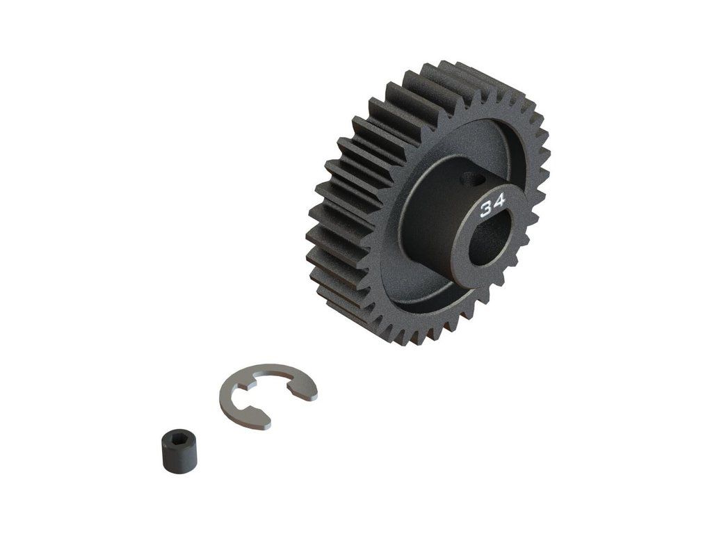 Arrma ocelový pastorek 34 zubů, modul M1, otvor Safe-D8. Otvor ve tvaru 'D' odpovídá profilu hřídele motoru s hřídelí 8mm a drážkou, proto se nemůže pastorek na hřídeli protočit. Stavěcí šroub - M4 x 4mm, segrovka 6mm. Precizně vyrobený široký profil zubu pro hladký chod.