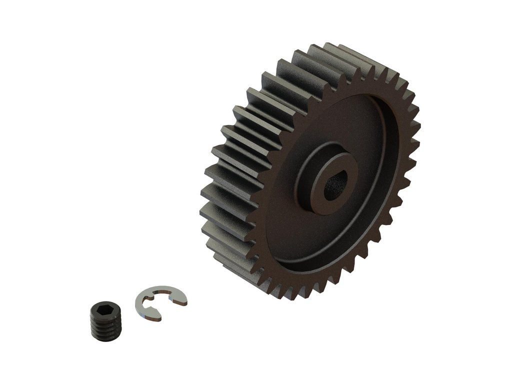 Arrma ocelový pastorek 35 zubů, modul M1, otvor Safe-D5. Otvor ve tvaru 'D' odpovídá profilu hřídele motoru s hřídelí 5mm a drážkou, proto se nemůže pastorek na hřídeli protočit. Stavěcí šroub - M4 x 4mm, segrovka 3,2mm. Precizně vyrobený široký profil zubu pro hladký chod.
