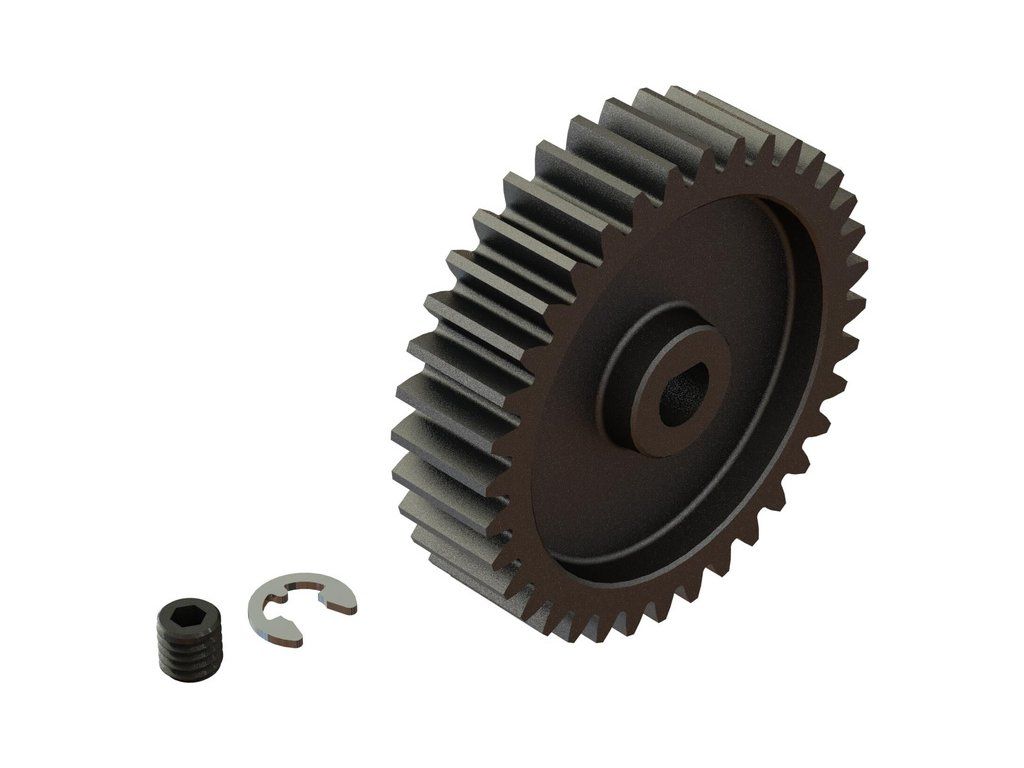 Arrma ocelový pastorek 36 zubů, modul M1, otvor Safe-D5. Otvor ve tvaru 'D' odpovídá profilu hřídele motoru s hřídelí 5mm a drážkou, proto se nemůže pastorek na hřídeli protočit. Stavěcí šroub - M4 x 4mm, segrovka 3,2mm. Precizně vyrobený široký profil zubu pro hladký chod.