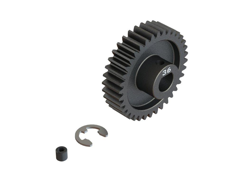 Arrma ocelový pastorek 36 zubů, modul M1, otvor Safe-D8. Otvor ve tvaru 'D' odpovídá profilu hřídele motoru s hřídelí 8mm a drážkou, proto se nemůže pastorek na hřídeli protočit. Stavěcí šroub - M4 x 4mm, segrovka 6mm. Precizně vyrobený široký profil zubu pro hladký chod.