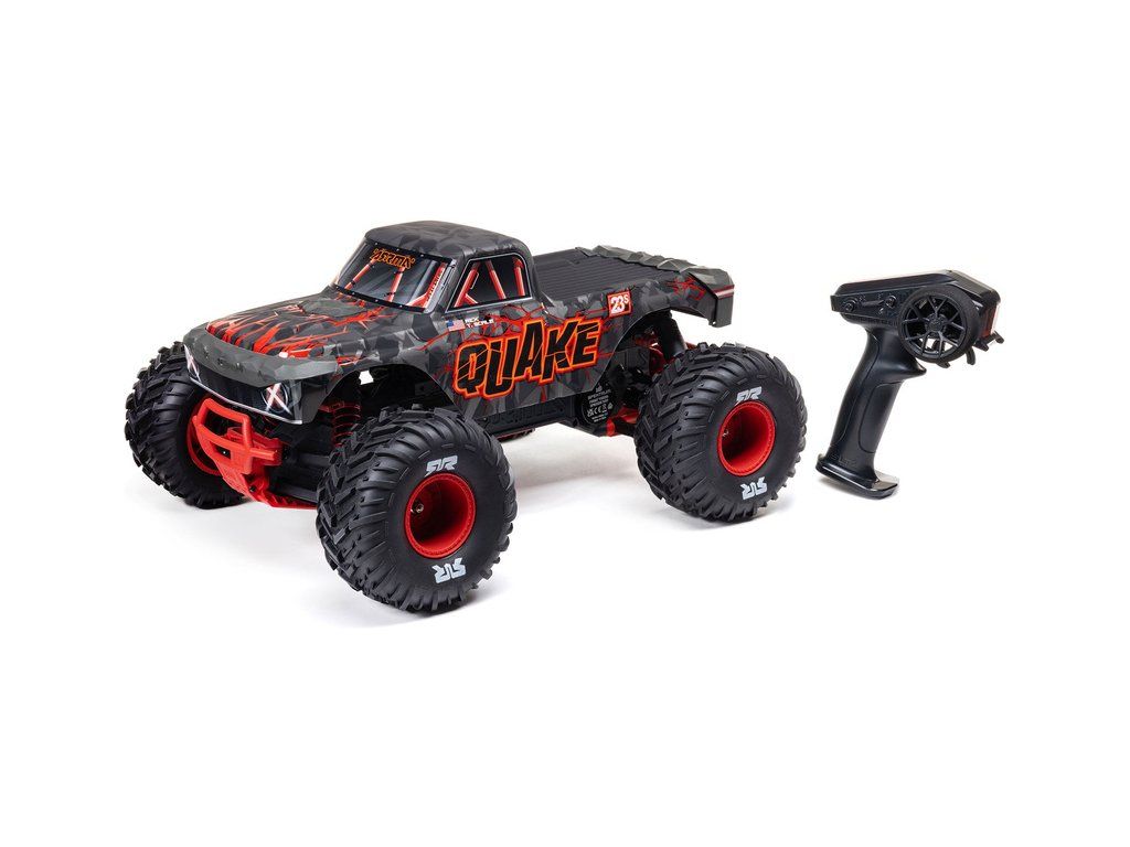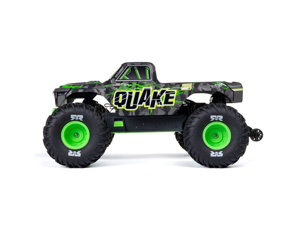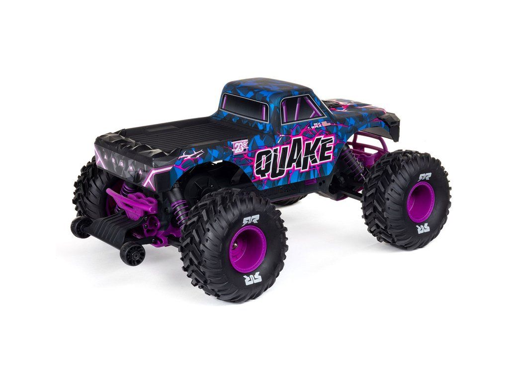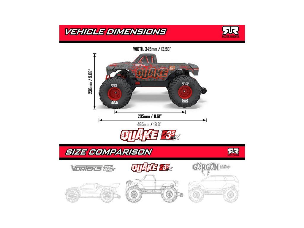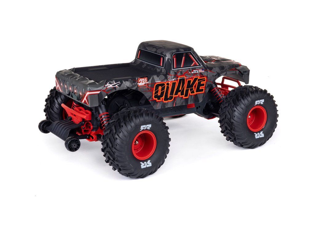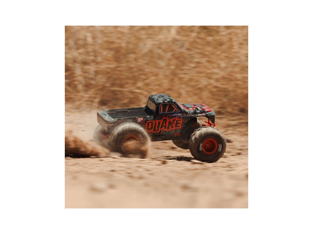 RC model monster trucku Arrma Quake 223S BLX s výkonným střídavým motorem a rychlostí až 80 km/h. Náhon 2WD, nezávislé zavěšení, olejové tlumiče, řídící jednotka Spektrum 45A SLT, napájení 2-3S LiPo, elektronická stabilizace DSC.
