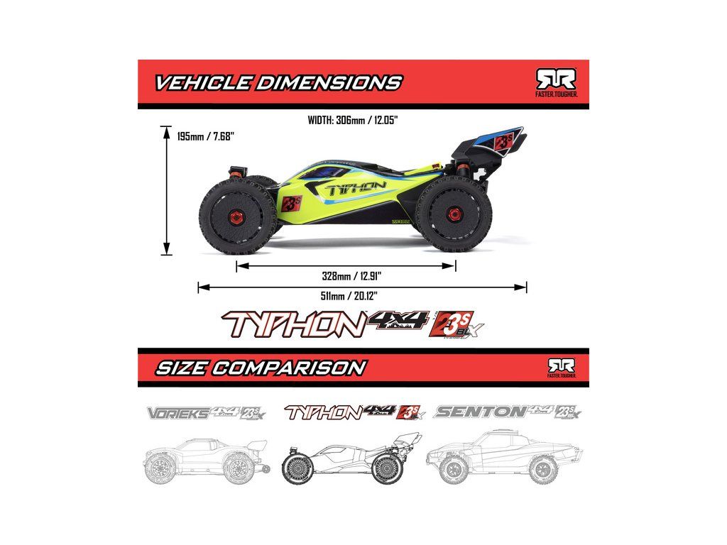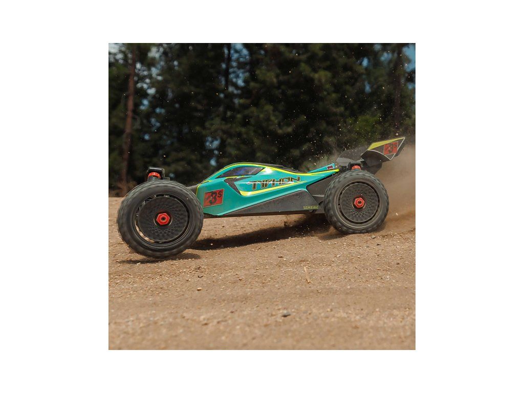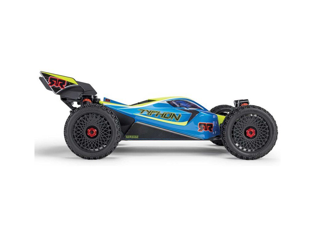RC model auta Arrma Typhon 223S BLX v měřítku 1:8, s náhonem 4WD, výkonným střídavým motorem a rychlostí až 80 km/h. Nezávislé zavěšení, olejové tlumiče, řídící jednotka Spektrum 80A SLT 2-3S LiPo, elektronická stabilizace DSC.