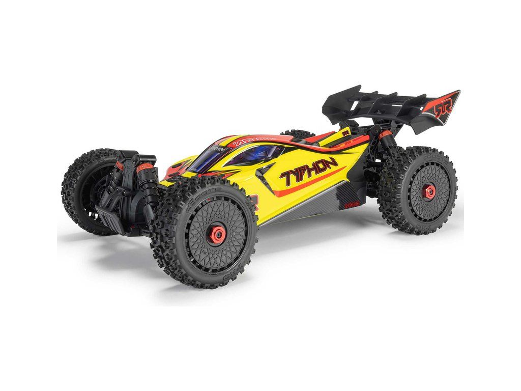RC model buggy Arrma Typhon Mega v měřítku 1:8 s pohonem 4x4 a rychlostí až 32 km/h. Odolné šasi s kluznými deskami a zvýšenými bočnicemi. Robustní diferenciály s kovovými převody. Nadrozměrný o 11% větší stejnosměrný motor 665. Olejové tlumiče. RC souprava Spektrum SLT2.