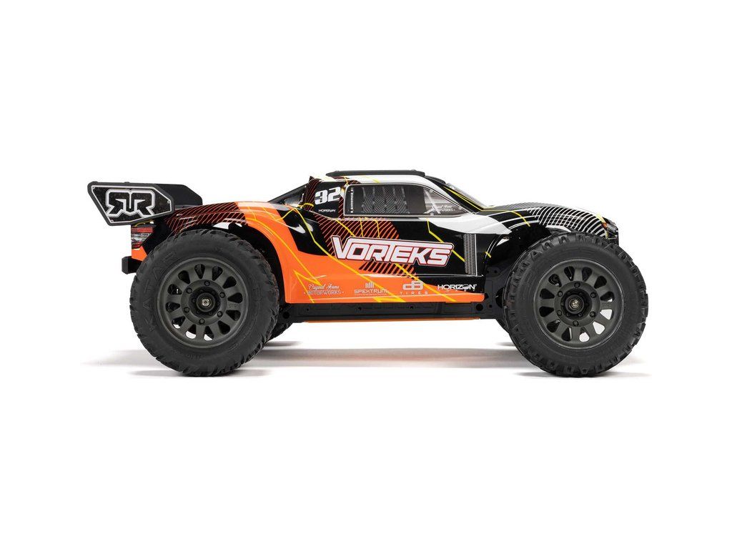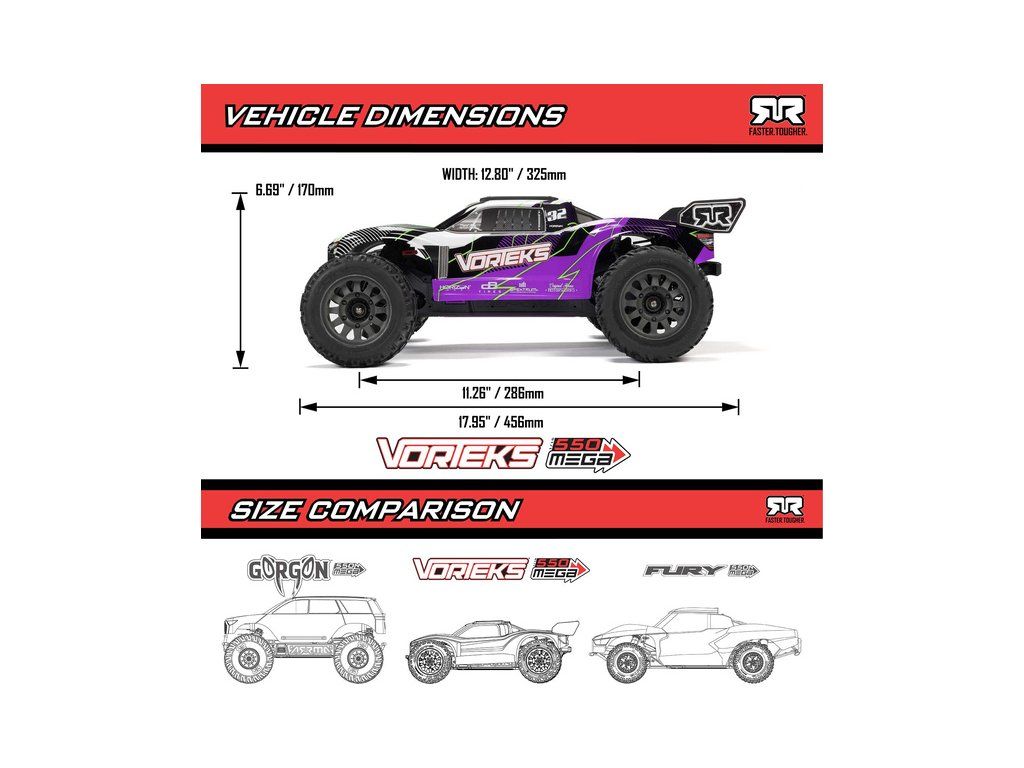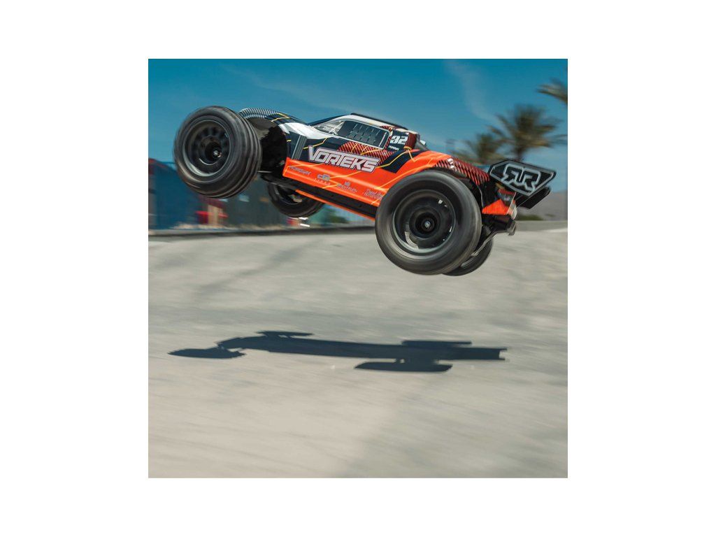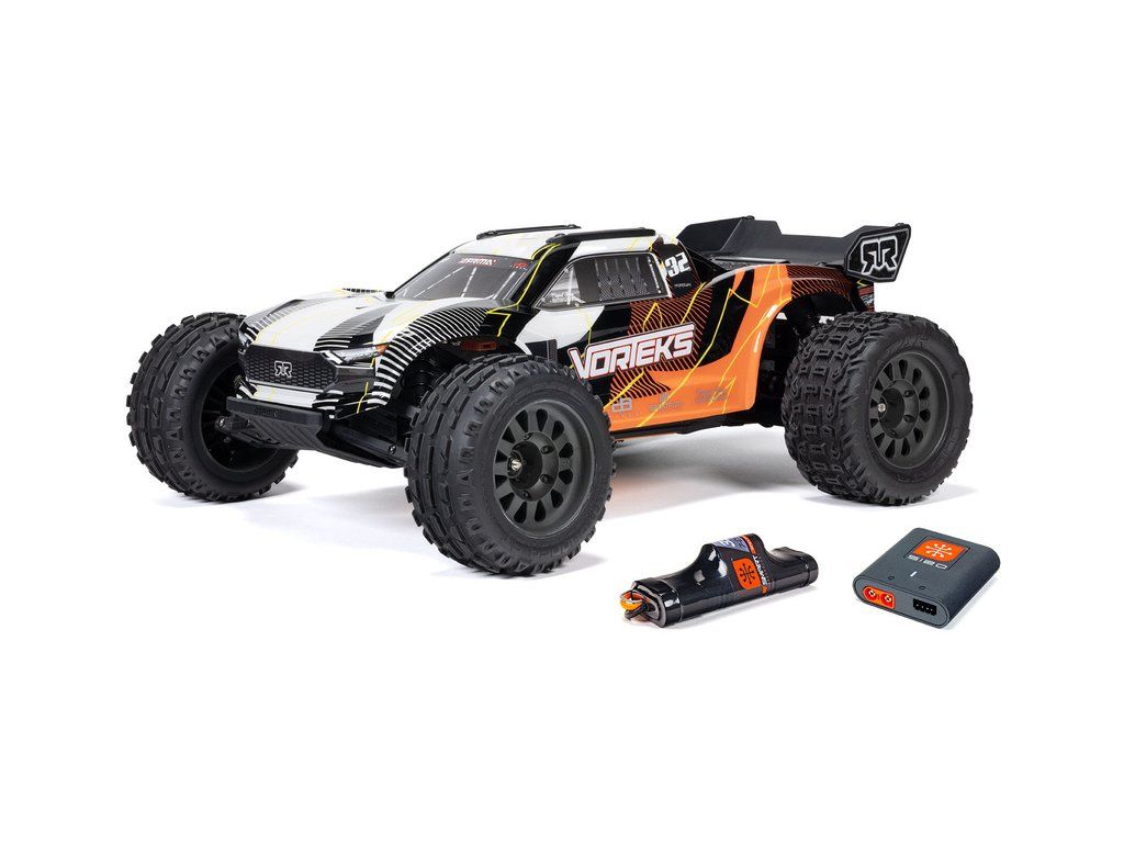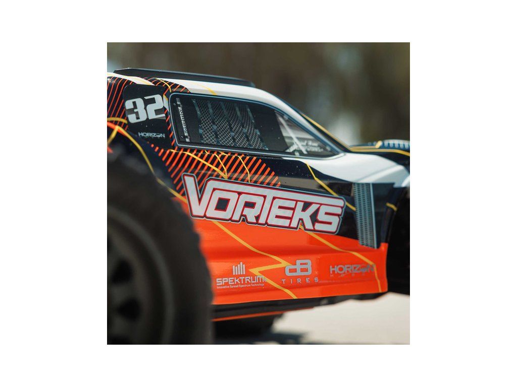 RC model Arrma Vorteks Mega 550 1:10 RTR je cenově dostupné auto na dálkové ovládání typu Truggy s náhonem 2WD, nezávislým zavěšením, olejovými tlumiči, proporcionálním řízením a stejnosměrným motorem. RC souprava SLT 2.4 GHz. V balení NiMH akumulátor a USB-C nabíječ.