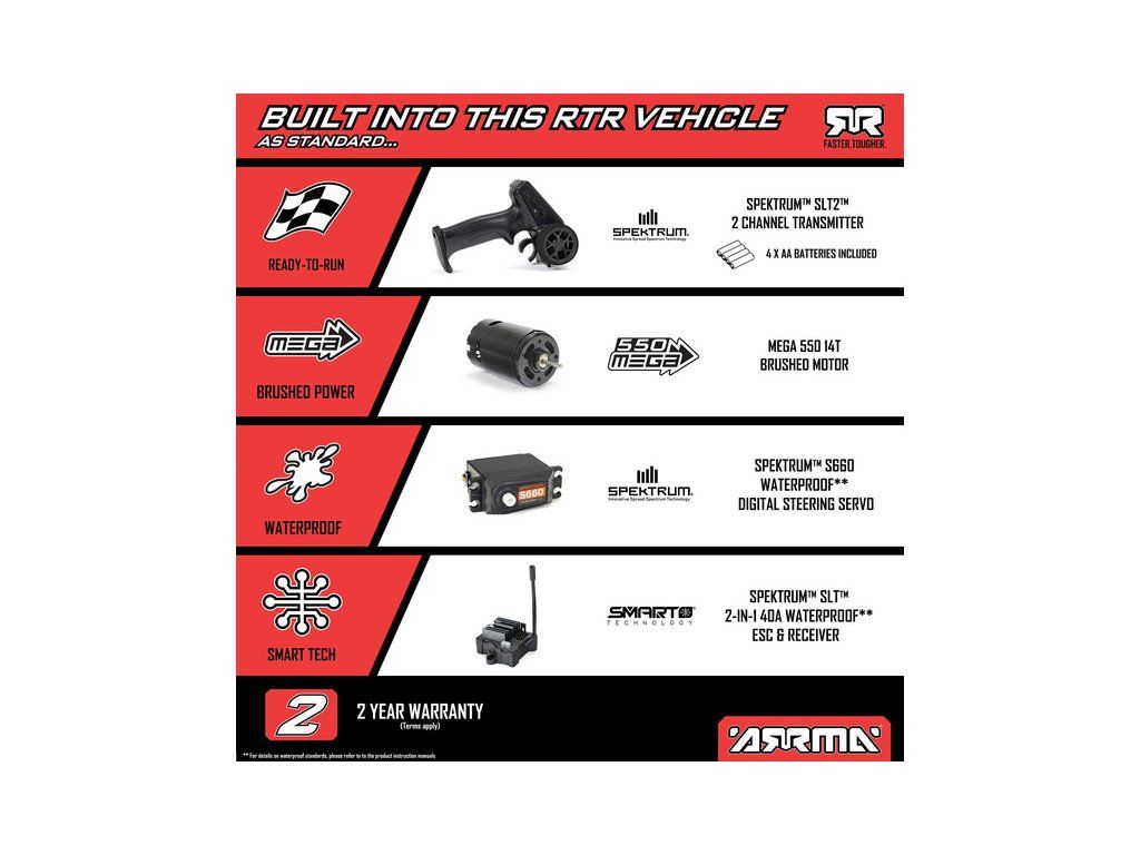 - Pro maximální dobu jízdy a větší akceleraci LiPo akumulátor Spektrum 7.4 V 5000 mAh s technologií Smart, nebo Spektrum G2 7.4 V 5000 mAh s technologií Smart G2.