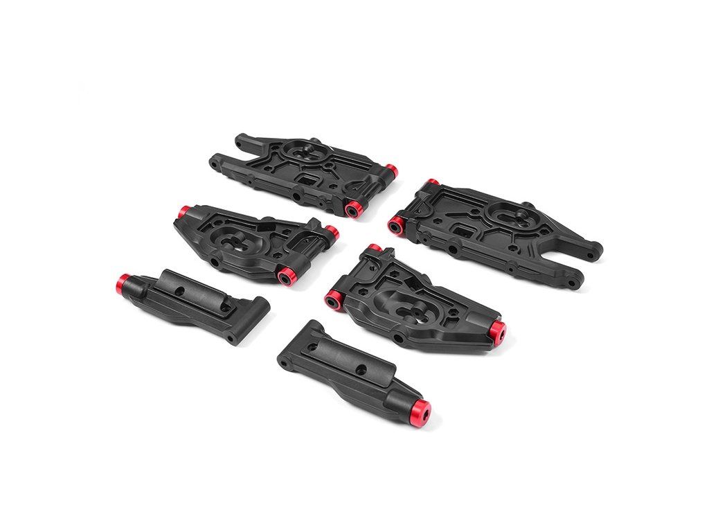 - Masivní kompozitová ramena zavěšení s vysokou odolností, s hliníkovými čepy závěsů a držáky otočných koulí pro působivou odolnost. Přední horní ramena jsou vybavena jedinečnou sadou pro aerodynamické řízení, která zajišťuje dodatečný přítlak a lepší odezvu řízení.