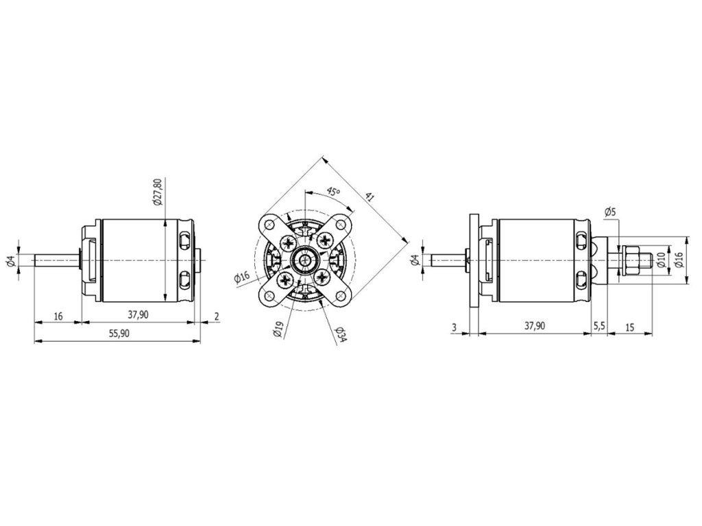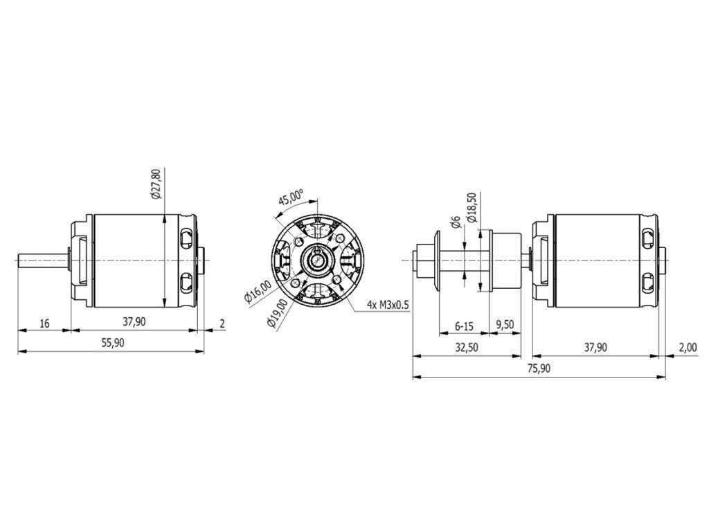 Střídavý elektromotor s rotačním pláštěm nové generace pro modely větroň do 1300g, trenér do 1200g, akro do 1100g, 3D 900g, napájení Lixx 2-3s, hřídel 4 mm, regulátor 30A.Doplňkové parametry