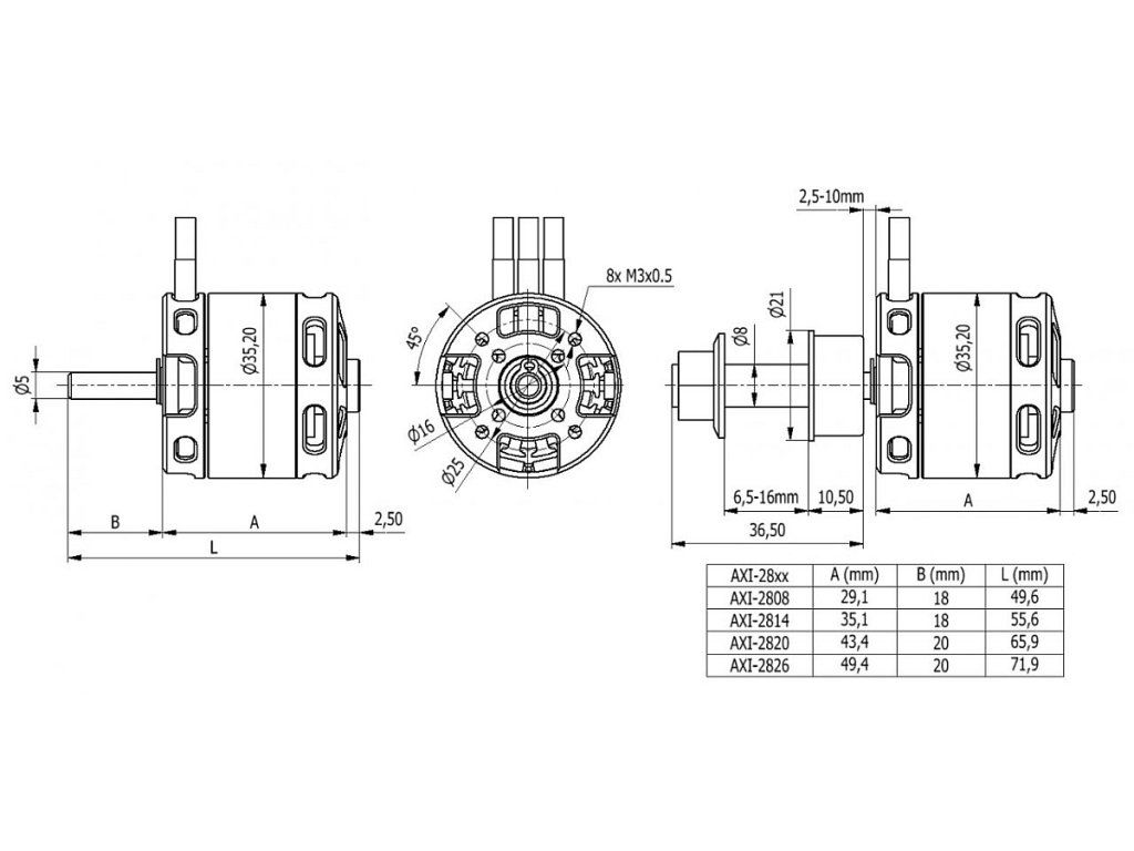 AXI 2808/16 V2 je střídavý motor učený pro pohon menších modelů s letovou hmotností do 1000 g s napájením z dvoučlánkového nebo tříčlánkového akumulátoru Li-poly. Výborně se hodí pro menší hotlinery a rychlé akrobatické modely, kterým lépe svědčí vrtule o menším průměru s vyšším počtem otáček.