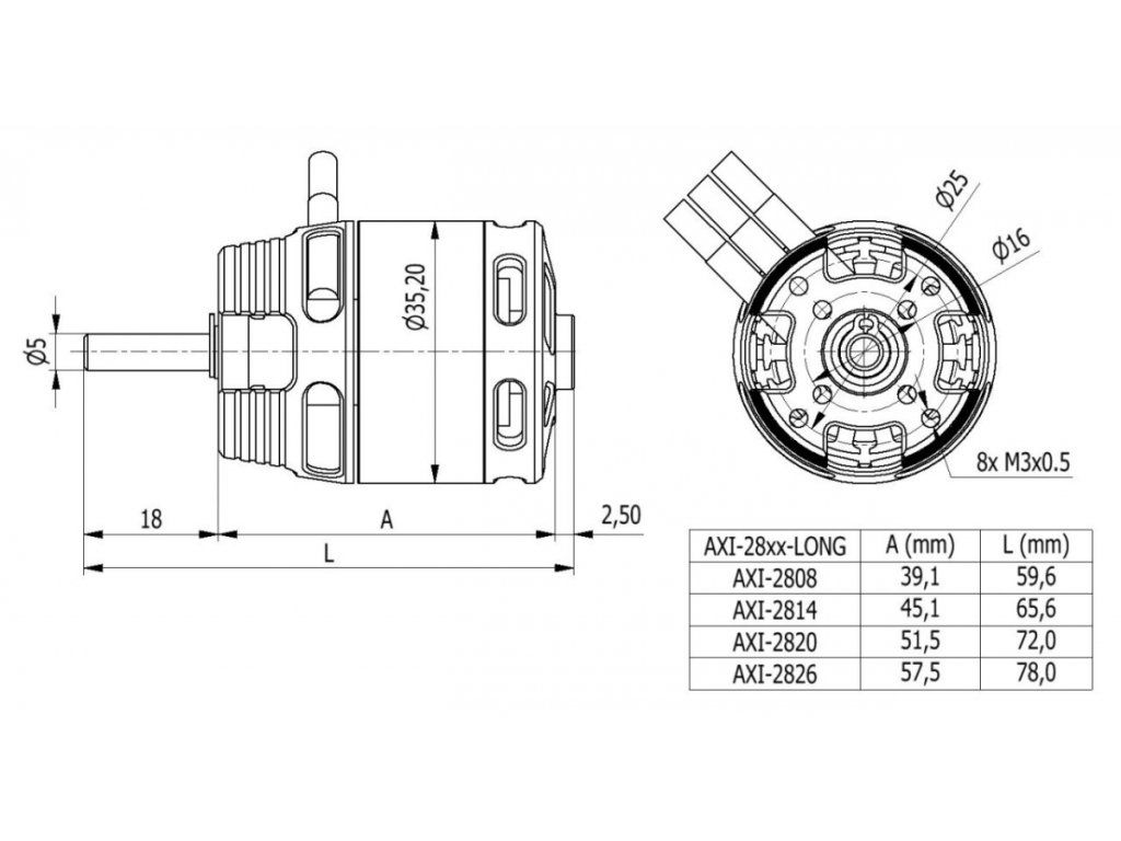 AXI 2826/6 V2 Long je střídavý motor učený pro pohon modelů s letovou hmotností do 2500 g s napájením z dvou- nebo tříčlánkového akumulátoru Li-poly. Výborně se hodí pro rychlé motorové větroně do 2500 g.