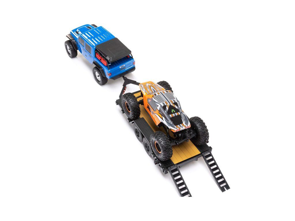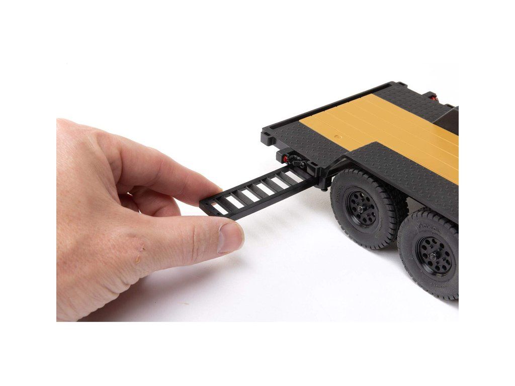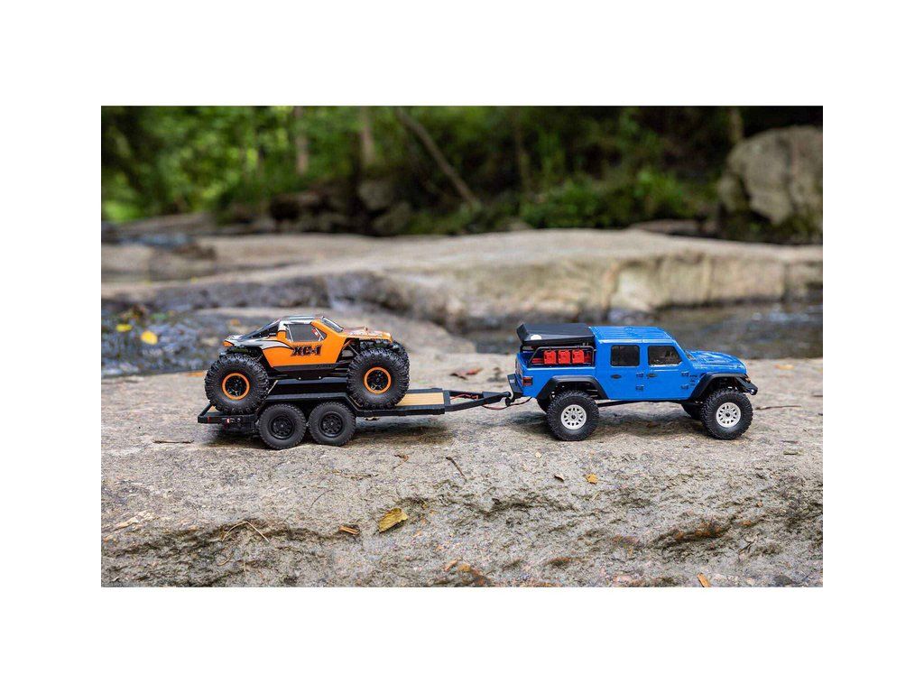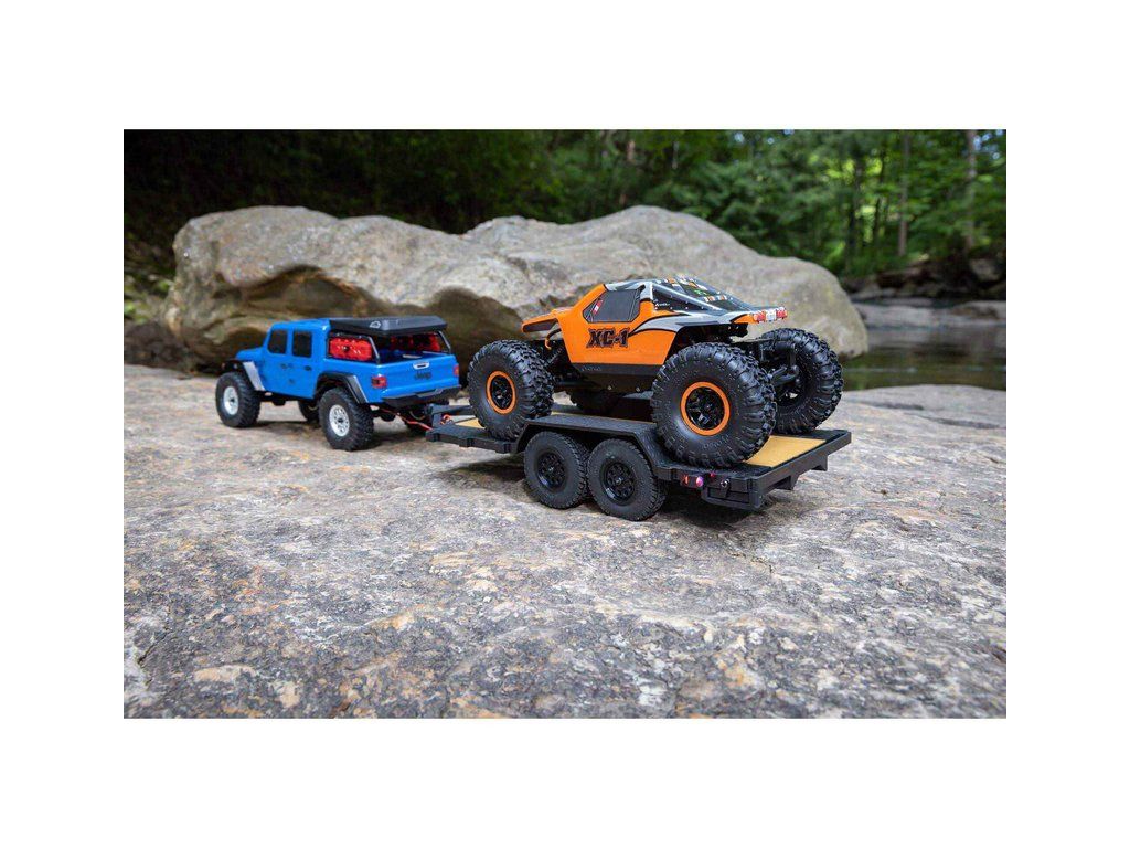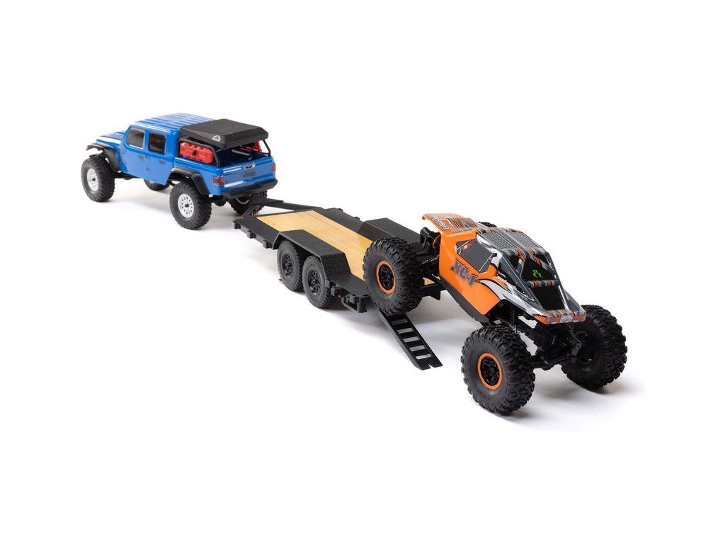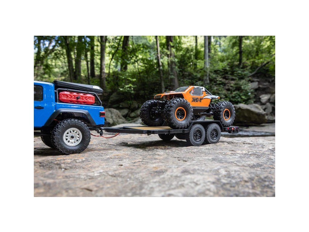 V balení je hotový sestavený Axial SCX24 přívěs s LED světly 1:24, nájezdovou rampou a tažným zařízením.