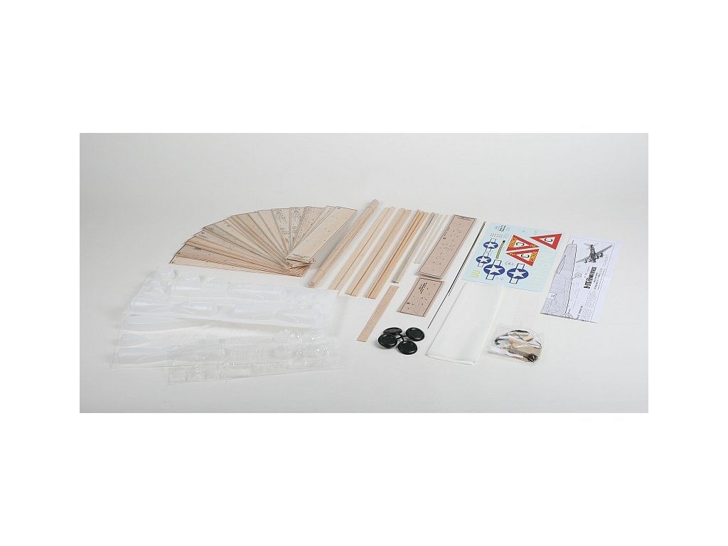 Stavebnice obsahuje: balsové předseknuté díly, balsové nosníky, předseknuté díly z plastikové překližky, vakuově lisované maketové díly (kryt motorů, motory, příď trupu...), plastová kola, ocelovou strunu na podvozek a další drobné díly, potahový papír, aršík mokrých obtisků, stavební plán.