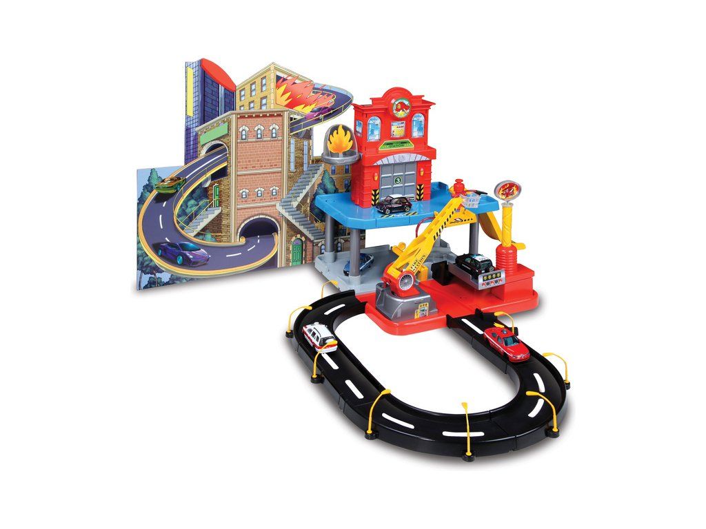 Balení obsahuje: 1 policejní a červené autíčko ( přibližně 10 cm velké ), 2 základny na každé patro, dekorační obrázek pozadí hořícího domu, výtah, 3 oblouky na vytvořen silničního okruhu, hasičskou stanici, požár na hašení, sjezd pro auta, stříkací sanice ( která opravdu funguje ), nálepky.