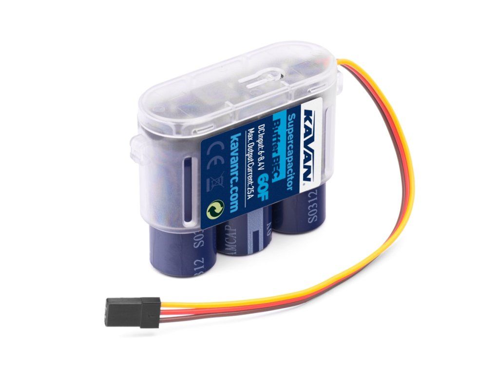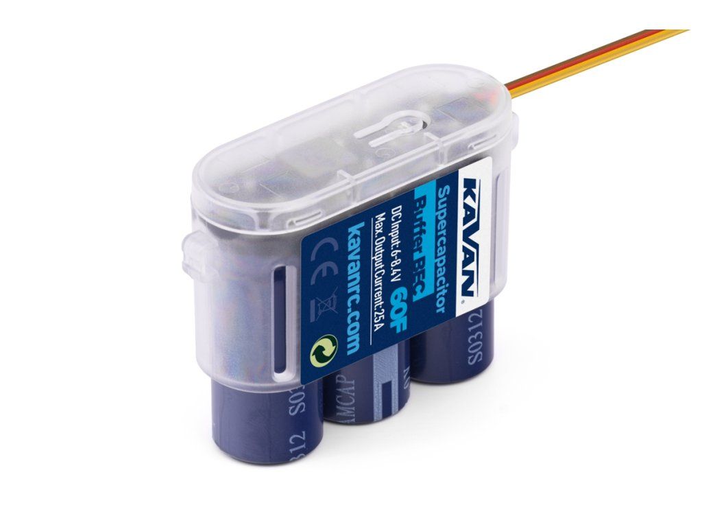 Filtrační superkondenzátor 60 F/6–8,4 V/max. 25 A pro filtrování napájecího napětí palubní elektroniky RC modelů. Kondenzátor s extrémně vysokou kapacitou umožňuje vyrovnávat krátkodobé odběrové špičky, které by jinak způsobily pokles napájecího napětí přijímače (s rizikem jeho vysazení).