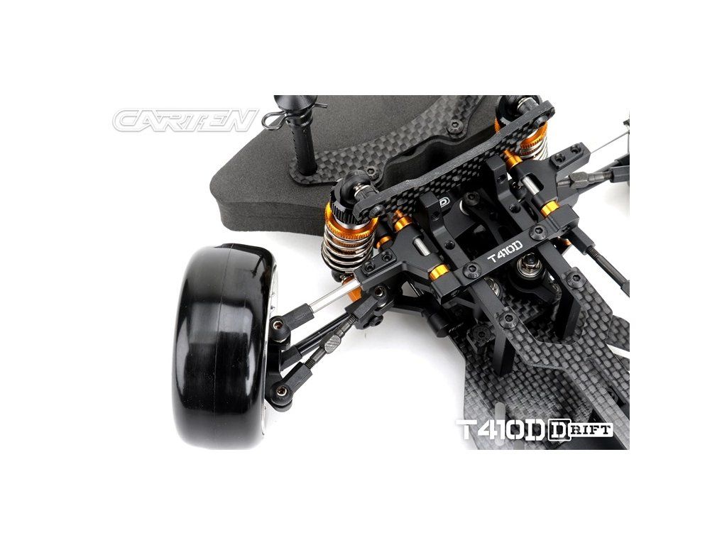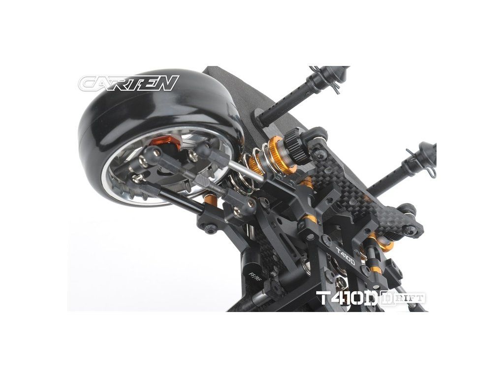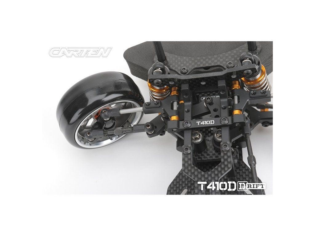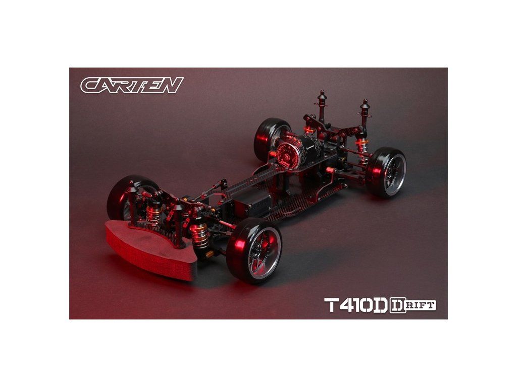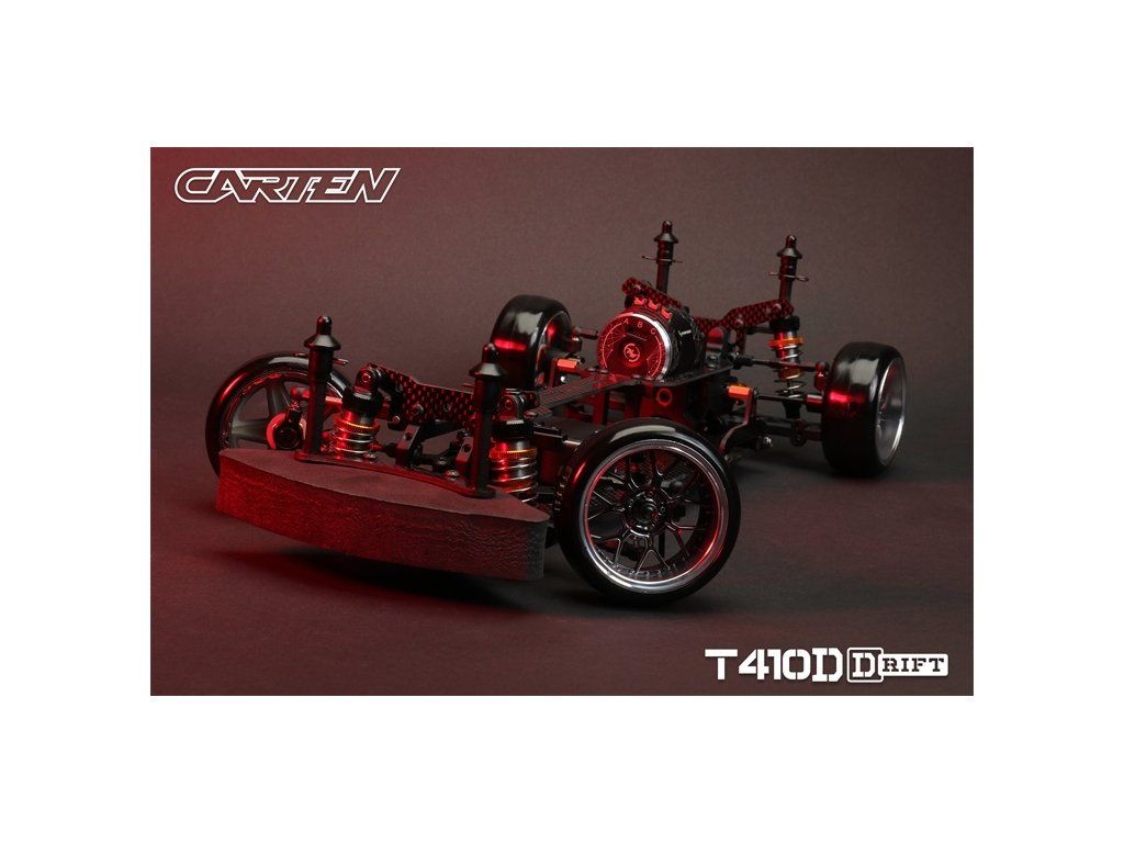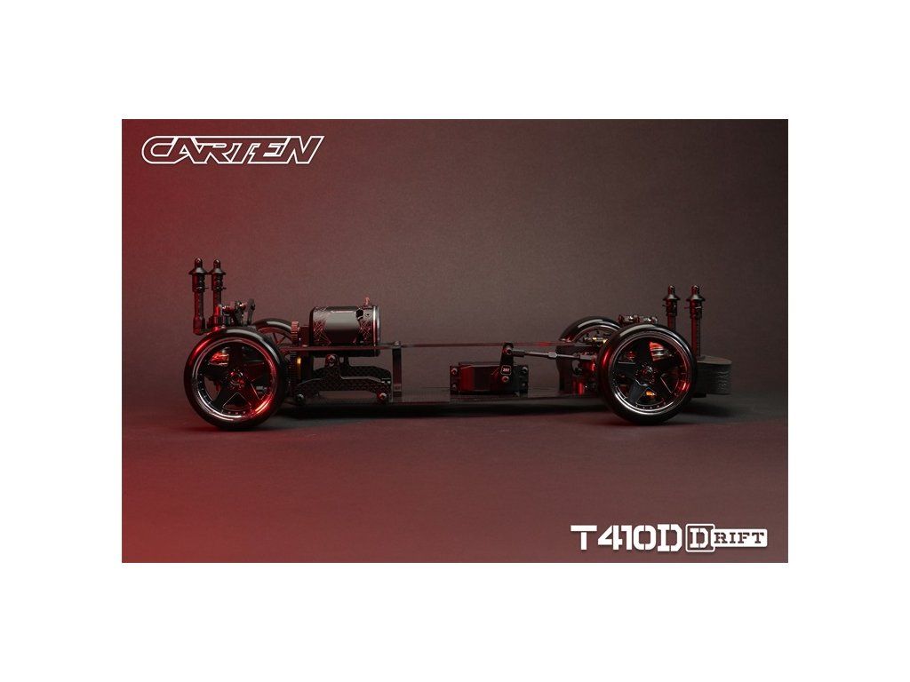 Stavebnice podvozku pro rekreační i soutěžní 1/10 RC drift. Carten T410D přináší kvalitní komponenty z karbonu a hliníku. Moderní layout zahrnuje podélné horní uložení motoru a držák akumulátoru v blízkosti zadní nápravy. Výsledkem je optimální těžiště a zatížení zadní nápravy optimální i pro závodní použití. Požadavkům náročných řidičů vyhoví i vysoký maximální úhel řízení a široké možnosti nastavení geometrie.