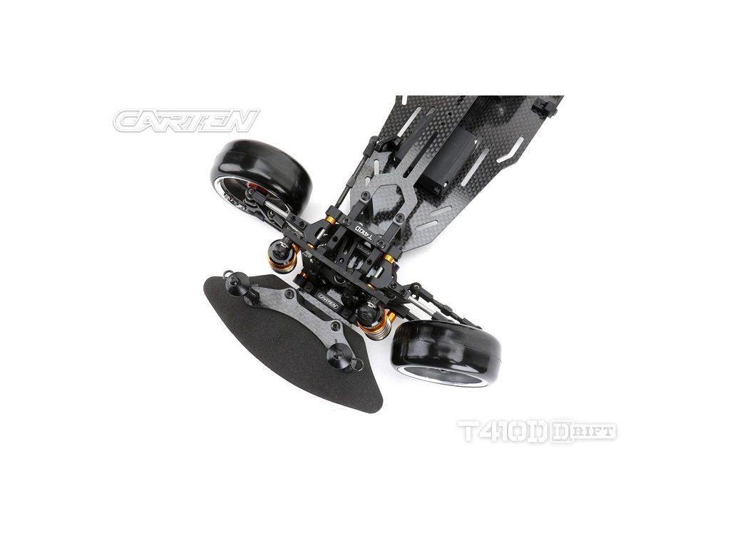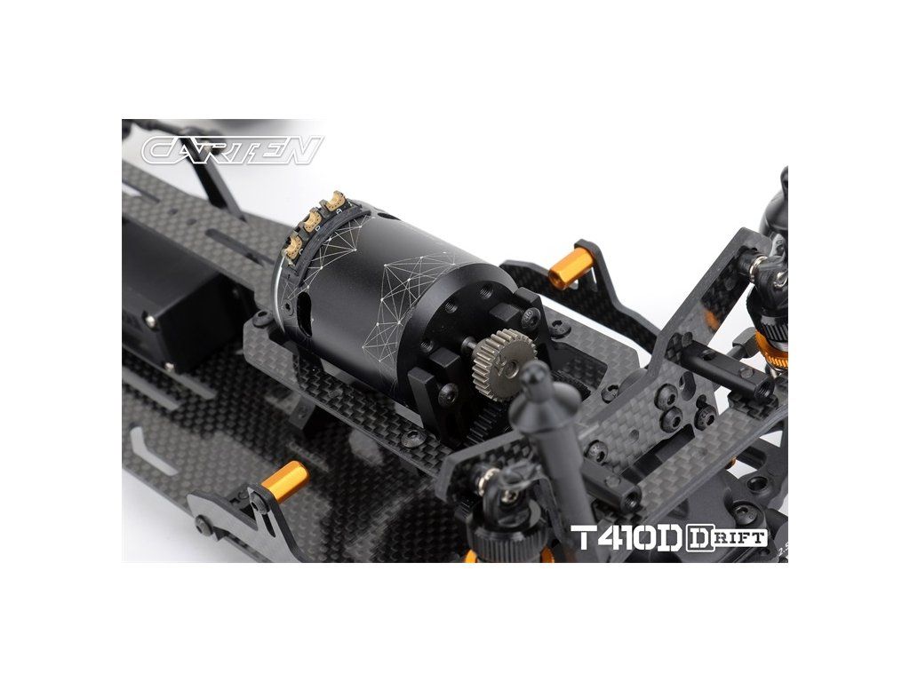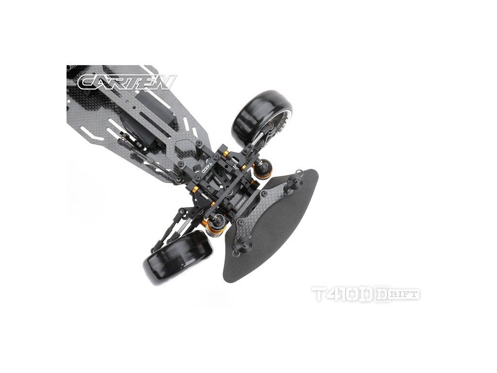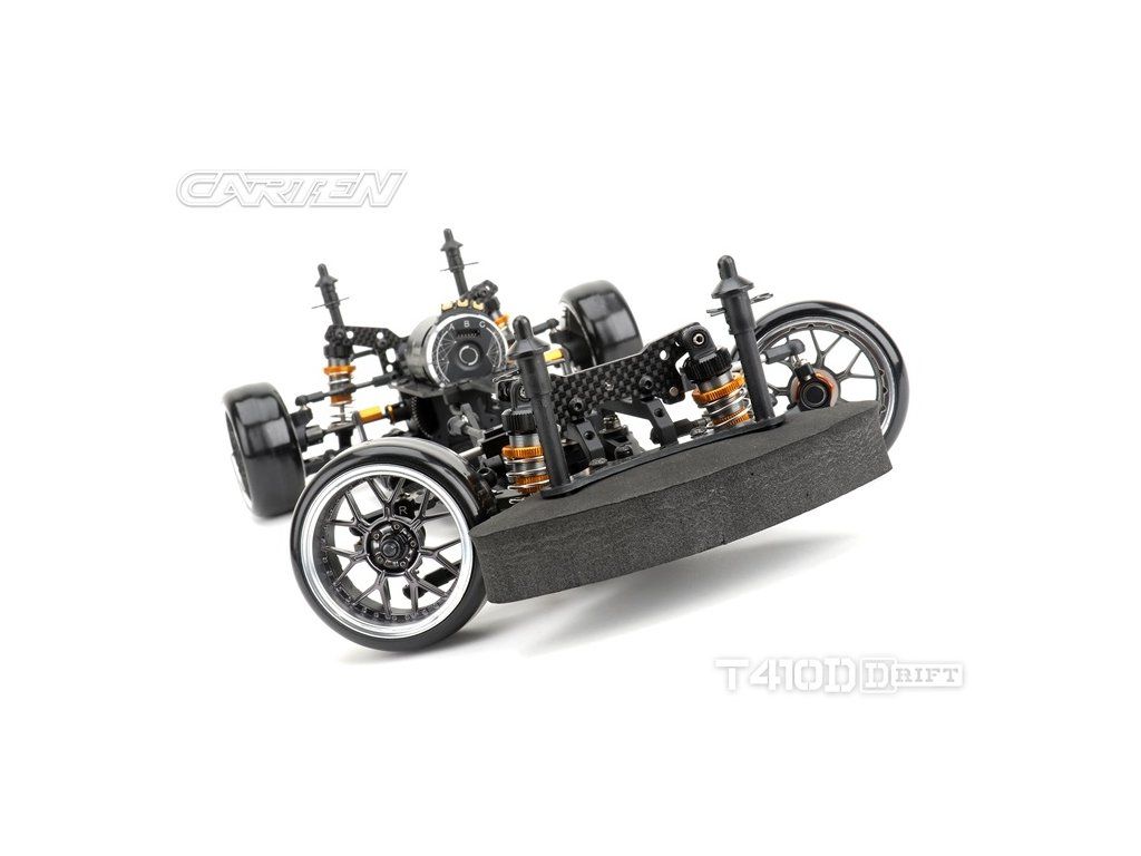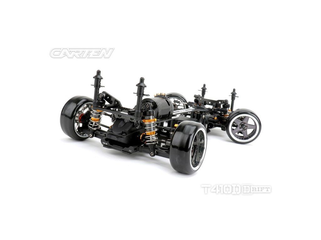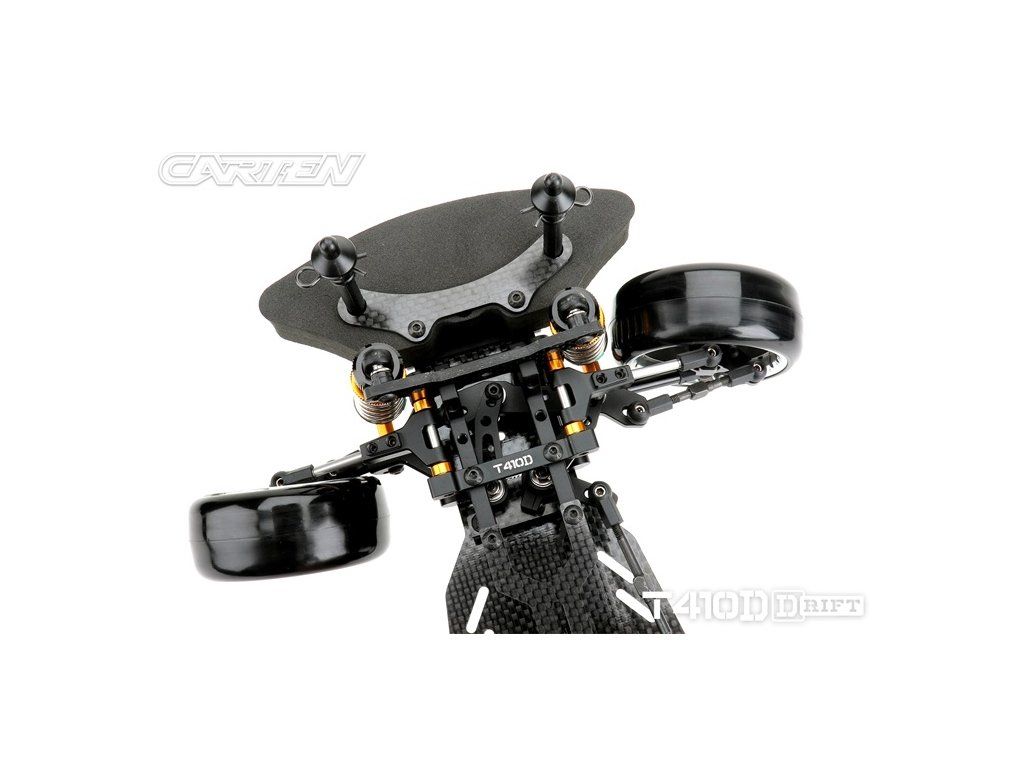 Stavebnice podvozku pro rekreační i soutěžní 1/10 RC drift. Carten T410D přináší kvalitní komponenty z karbonu a hliníku. Moderní layout zahrnuje podélné horní uložení motoru a držák akumulátoru v blízkosti zadní nápravy. Výsledkem je optimální těžiště a zatížení zadní nápravy optimální i pro závodní použití. Požadavkům náročných řidičů vyhoví i vysoký maximální úhel řízení a široké možnosti nastavení geometrie.