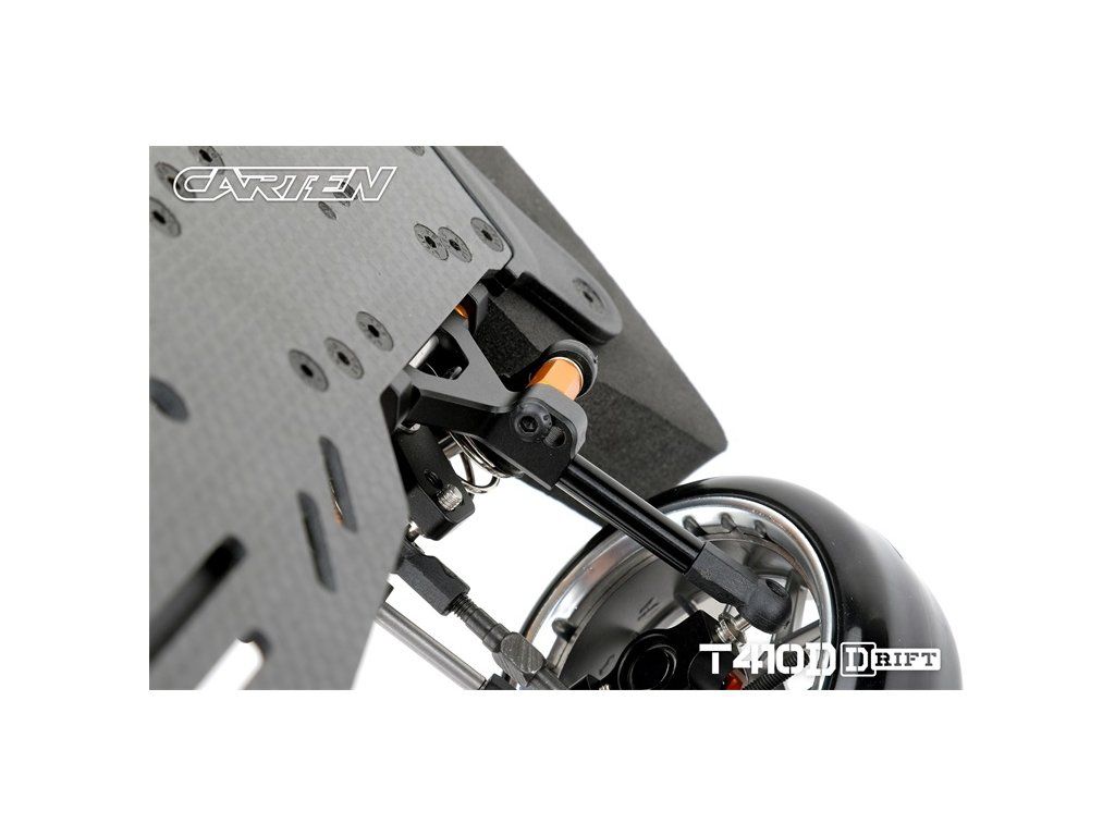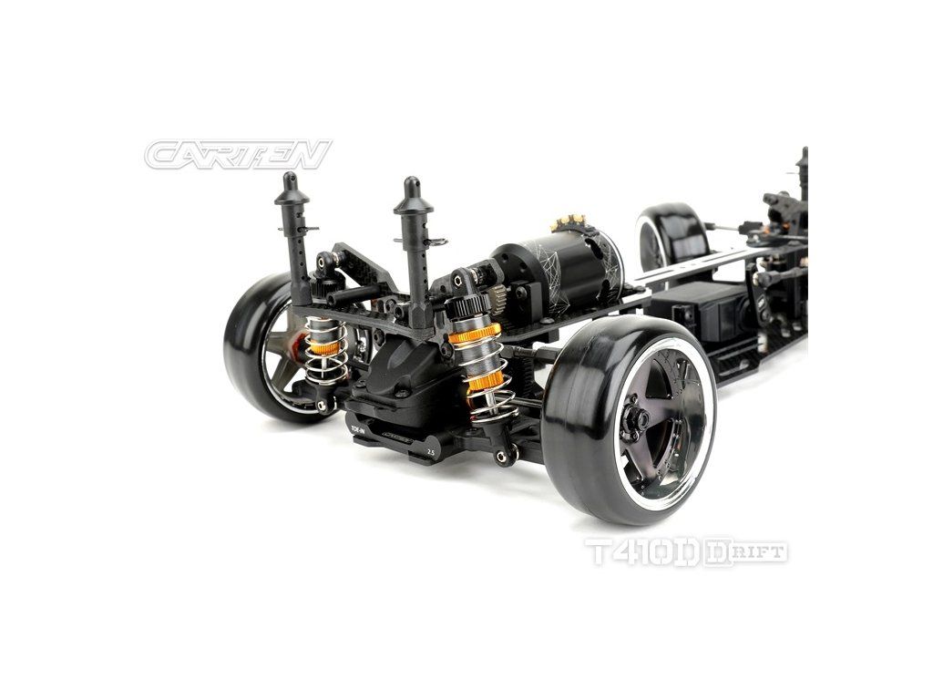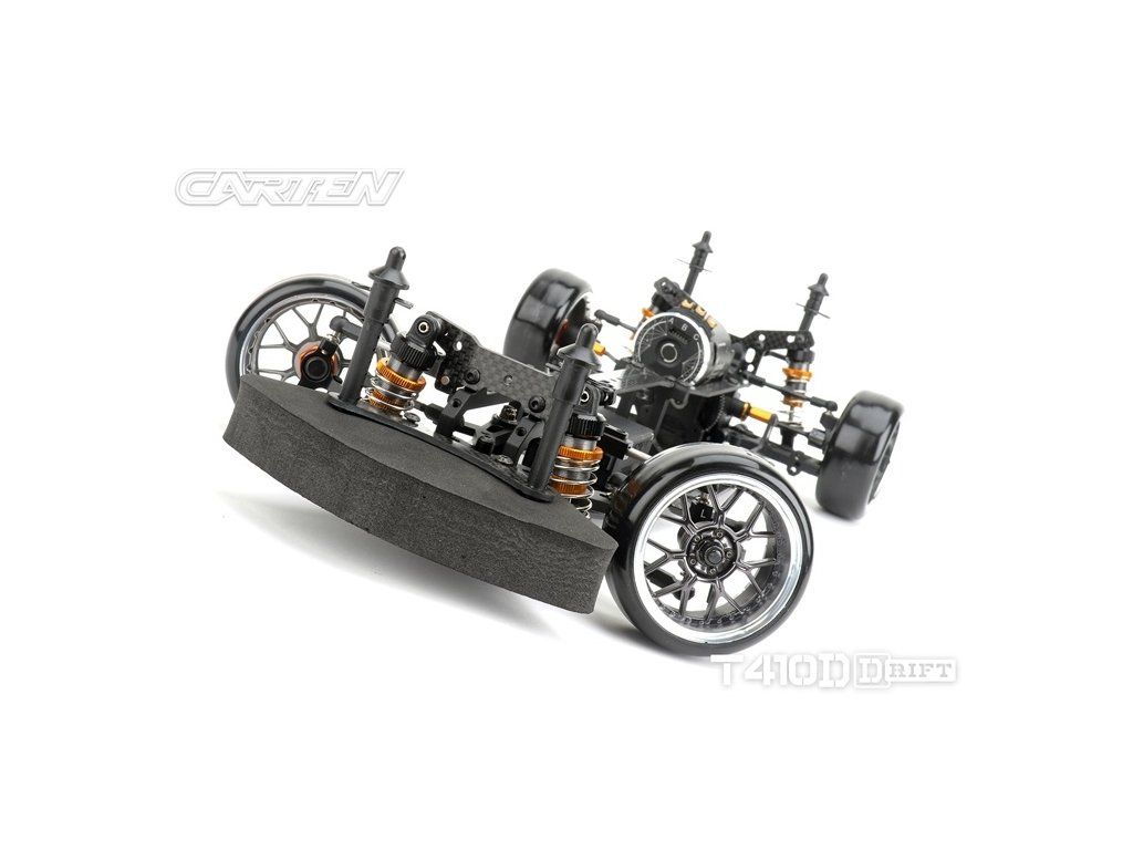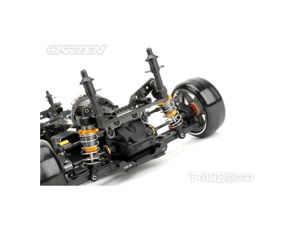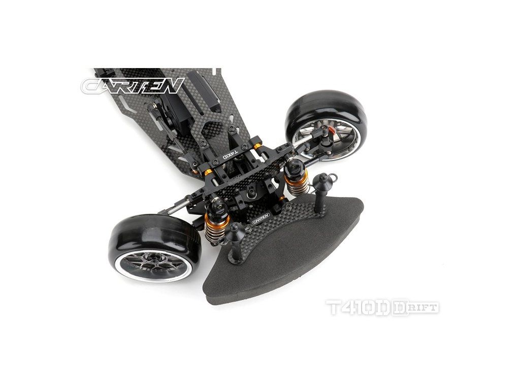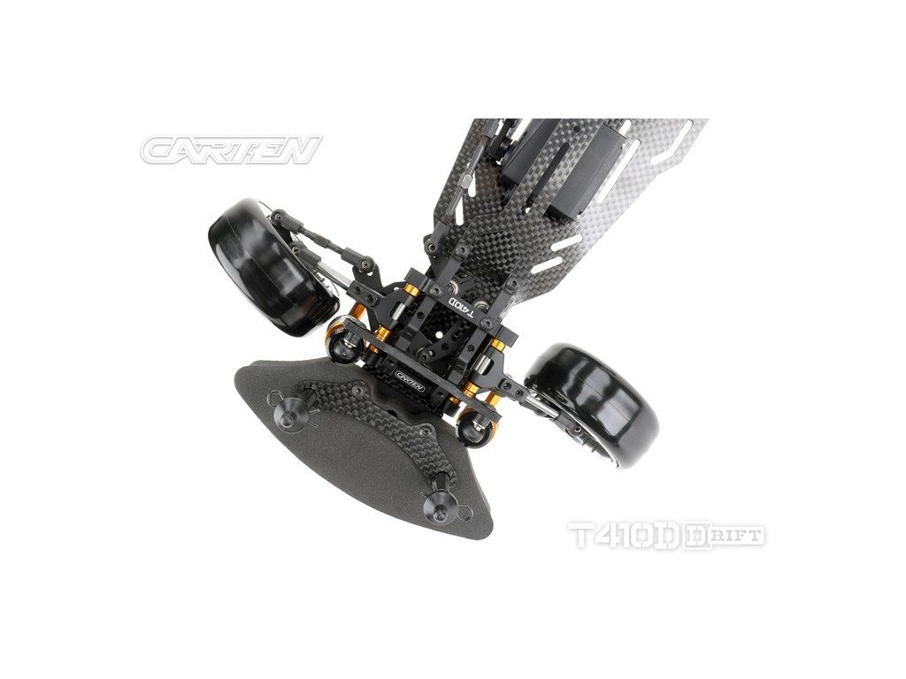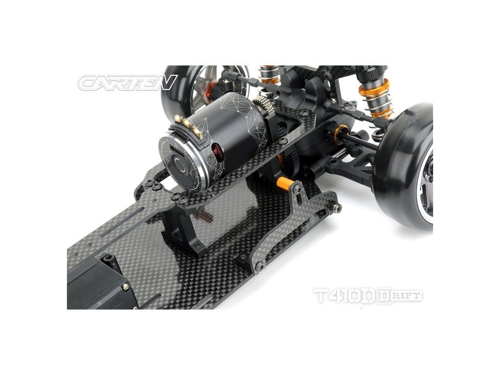 Stavebnice podvozku pro rekreační i soutěžní 1/10 RC drift. Carten T410D přináší kvalitní komponenty z karbonu a hliníku. Moderní layout zahrnuje podélné horní uložení motoru a držák akumulátoru v blízkosti zadní nápravy. Výsledkem je optimální těžiště a zatížení zadní nápravy optimální i pro závodní použití. Požadavkům náročných řidičů vyhoví i vysoký maximální úhel řízení a široké možnosti nastavení geometrie.