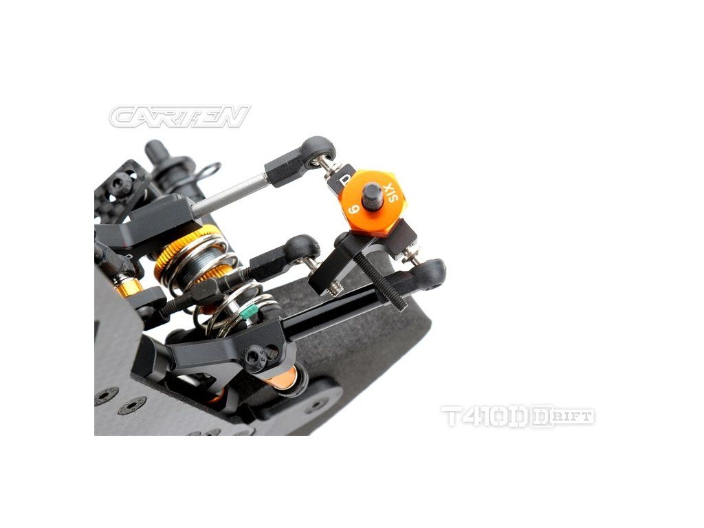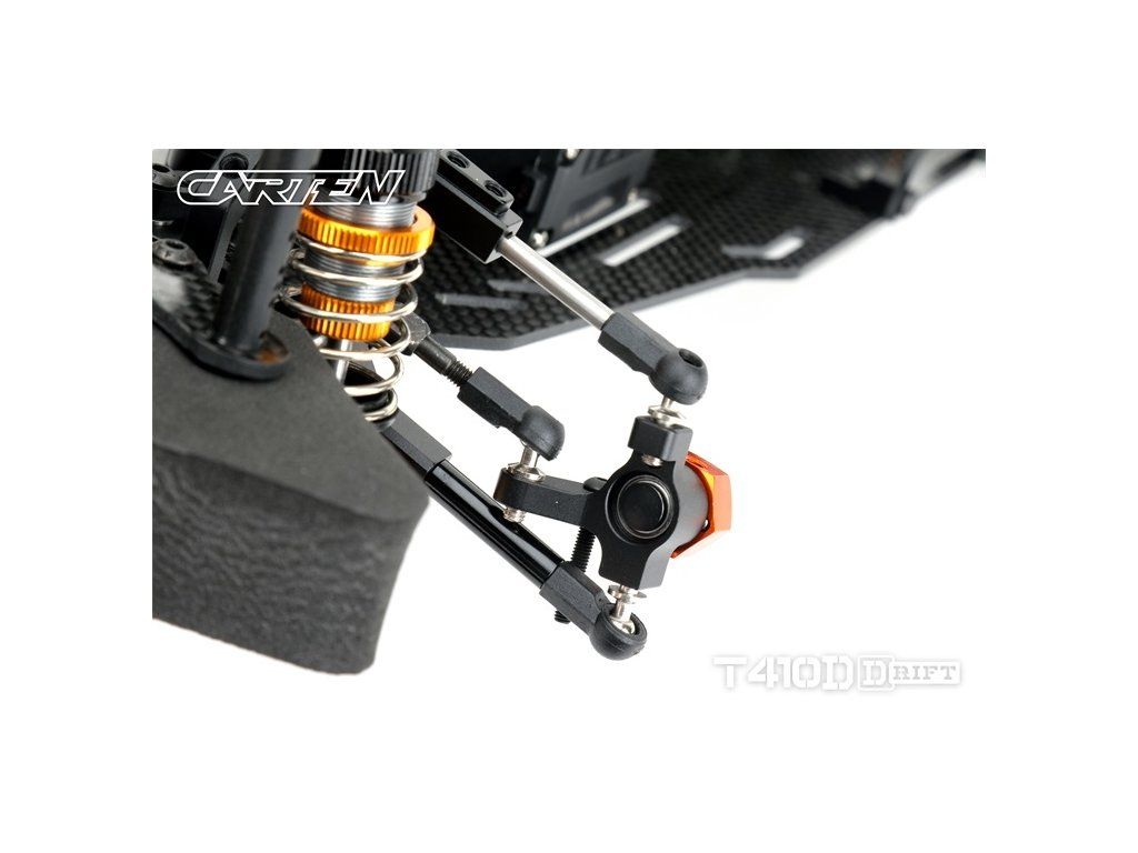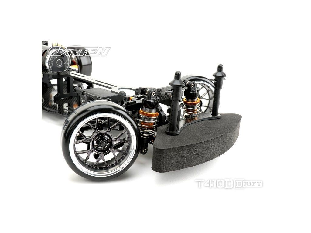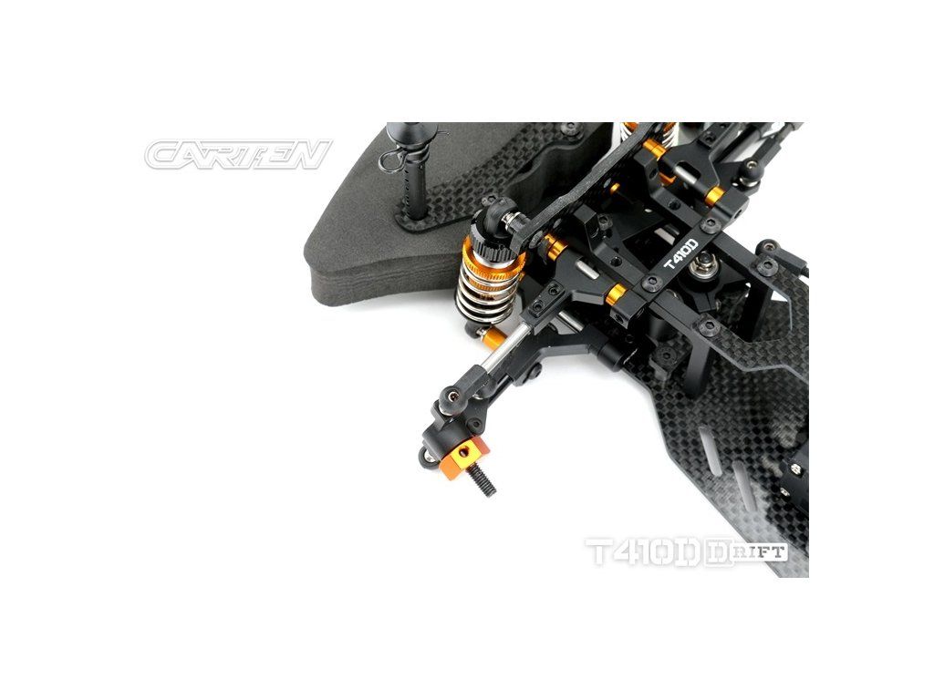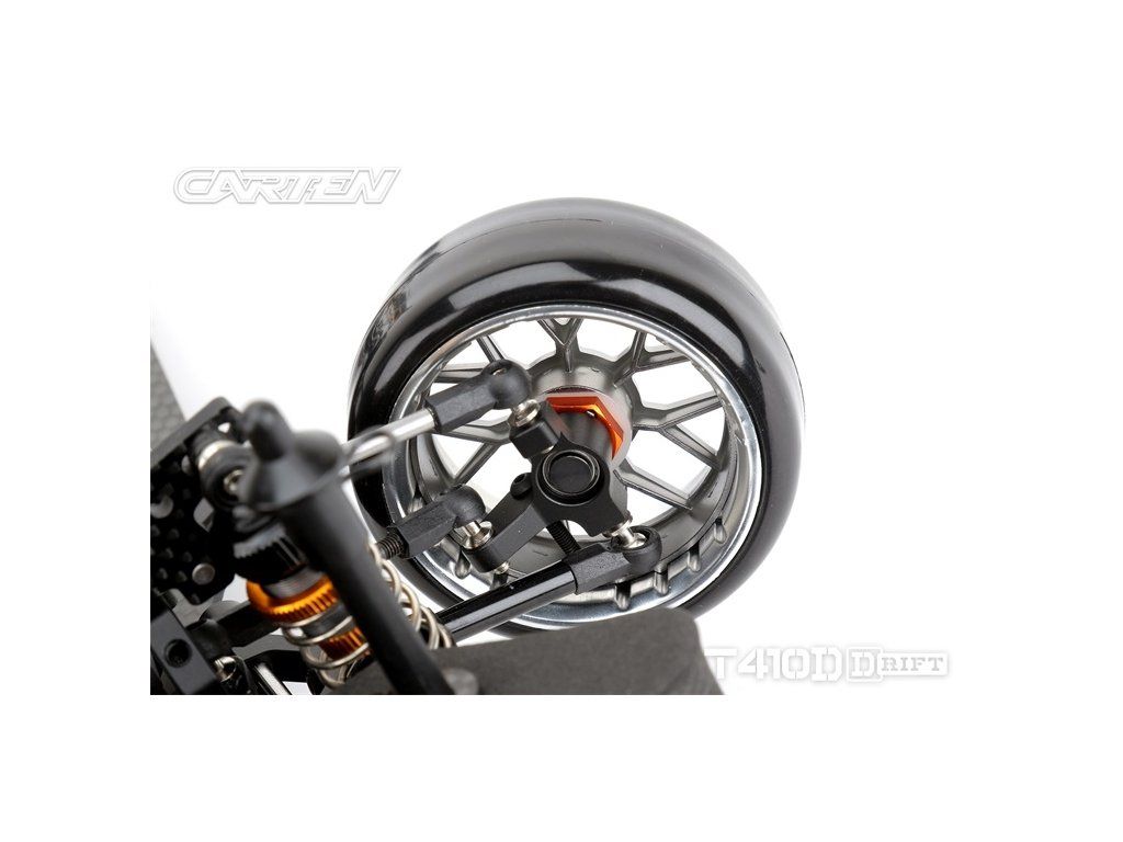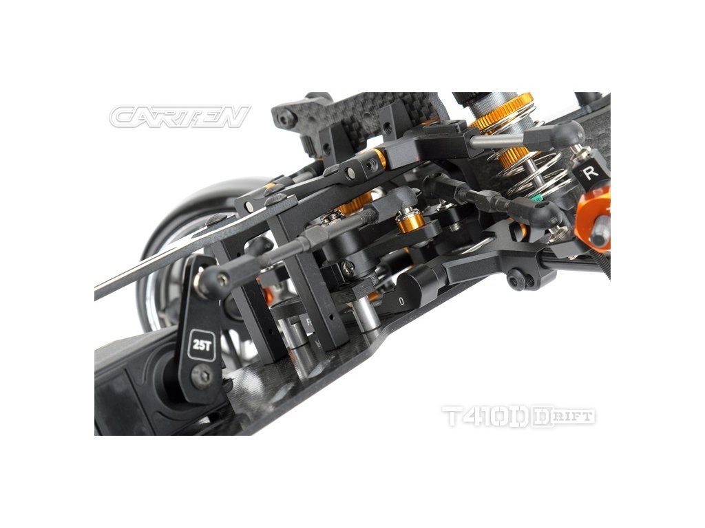 Stavebnice podvozku pro rekreační i soutěžní 1/10 RC drift. Carten T410D přináší kvalitní komponenty z karbonu a hliníku. Moderní layout zahrnuje podélné horní uložení motoru a držák akumulátoru v blízkosti zadní nápravy. Výsledkem je optimální těžiště a zatížení zadní nápravy optimální i pro závodní použití. Požadavkům náročných řidičů vyhoví i vysoký maximální úhel řízení a široké možnosti nastavení geometrie.